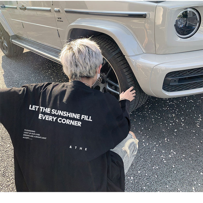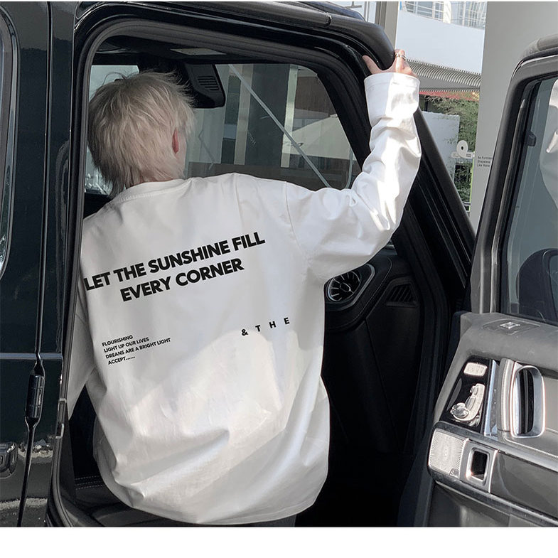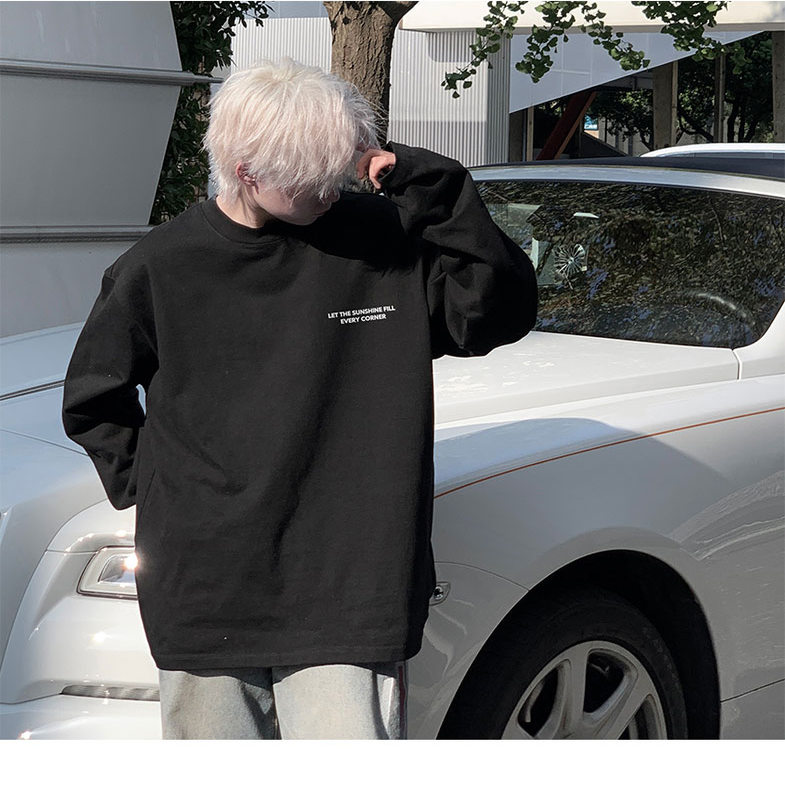 美式高街重磅圆领纯棉长袖t恤男款潮流秋季宽松字母印花百搭上衣