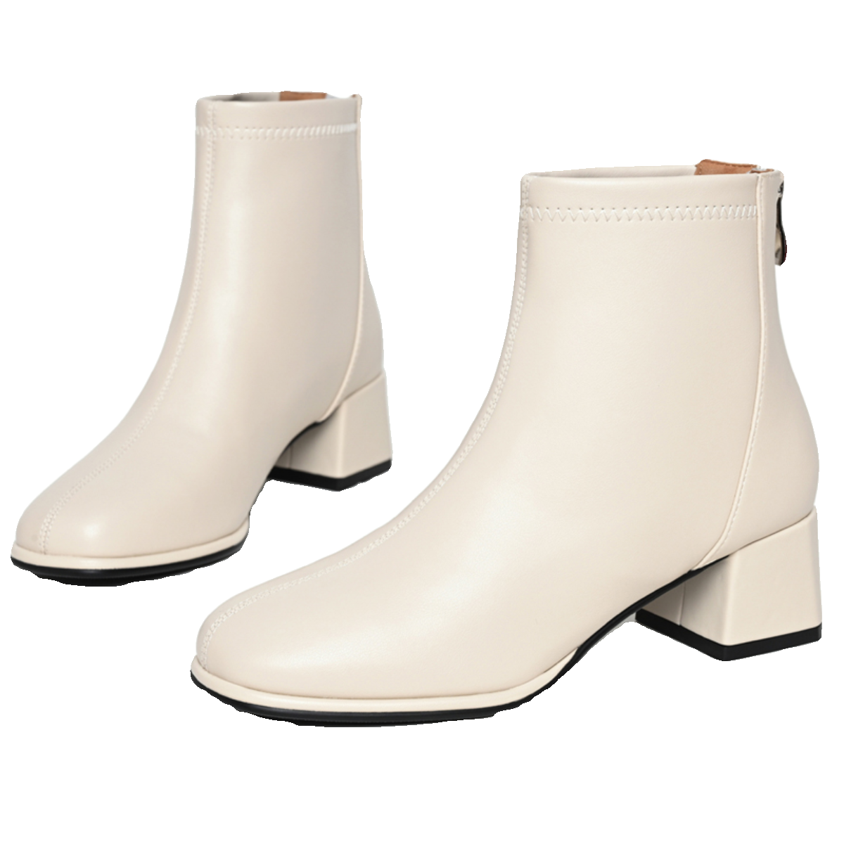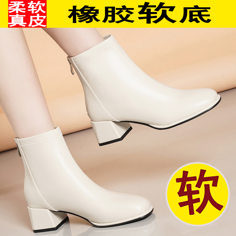 全牛皮真皮短靴女中跟瘦瘦靴粗跟方头白色靴子女靴百搭单靴马丁靴