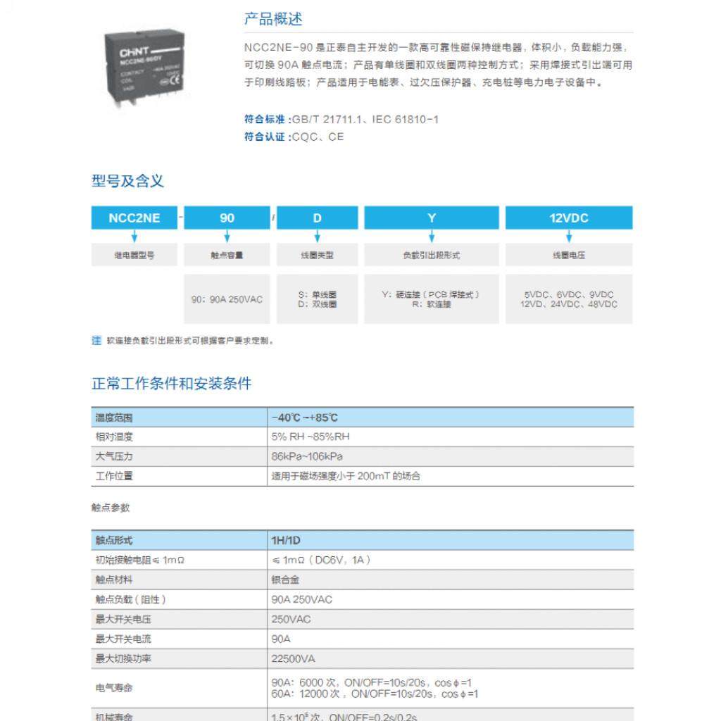 正泰磁保持继电器NCC2NE-90大电流低功耗充电桩重合闸直焊PCB板