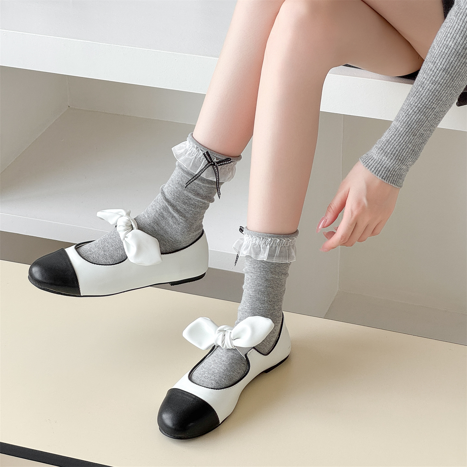 女士纯棉花边蝴蝶结装饰袜 中筒袜 全店5双包邮