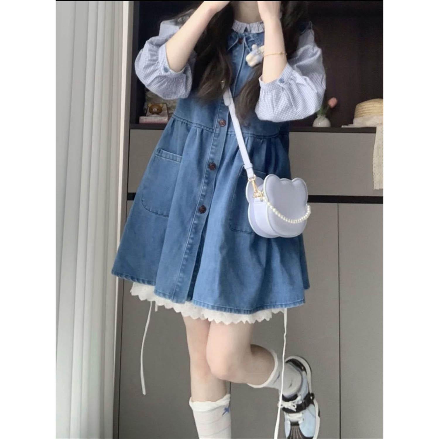 牛仔连衣裙+蓝色格纹内搭衬衫