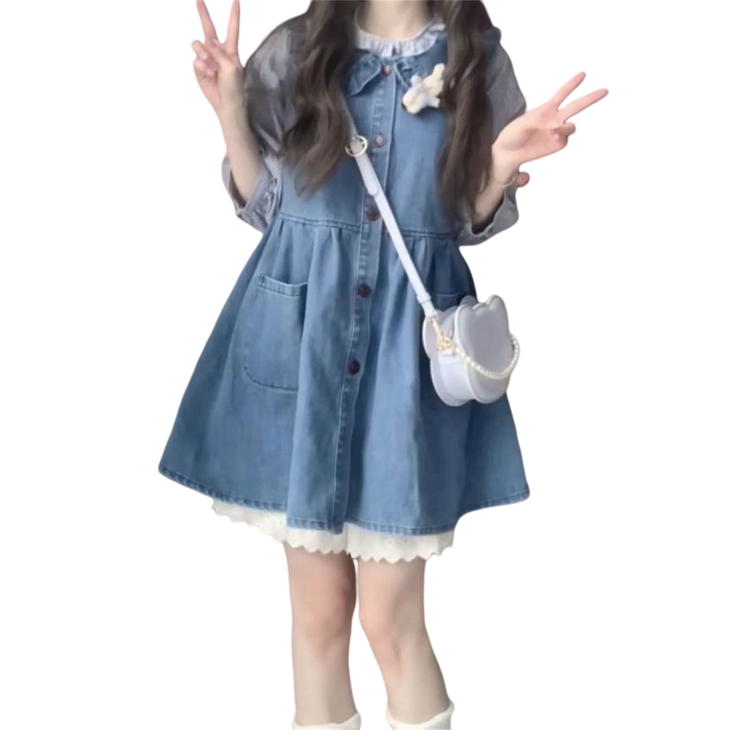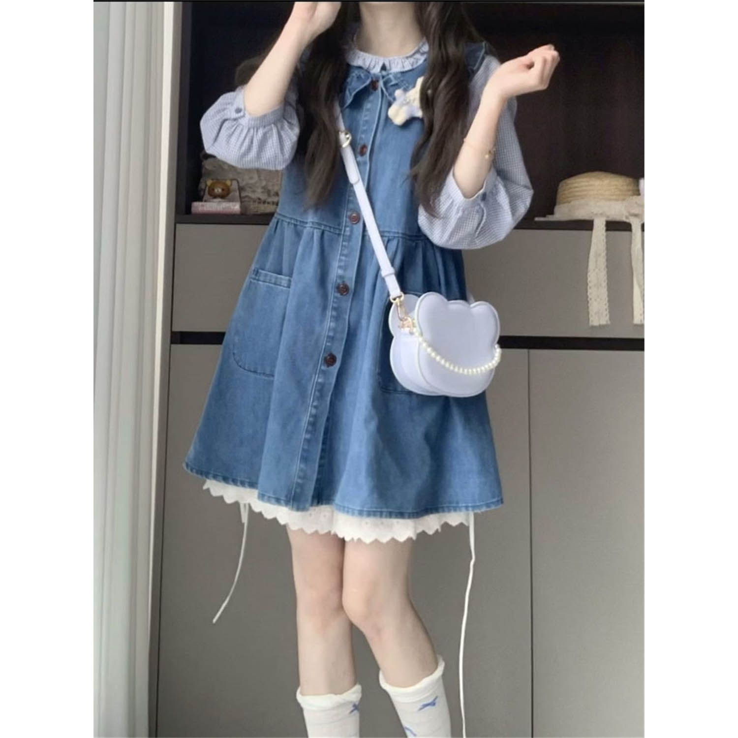 夏季新款韩系甜美温柔单排扣翻领牛仔连衣裙搭配蓝色格纹内搭衬衫