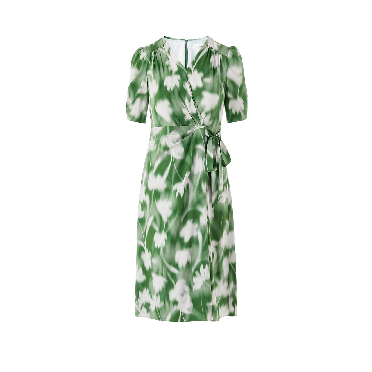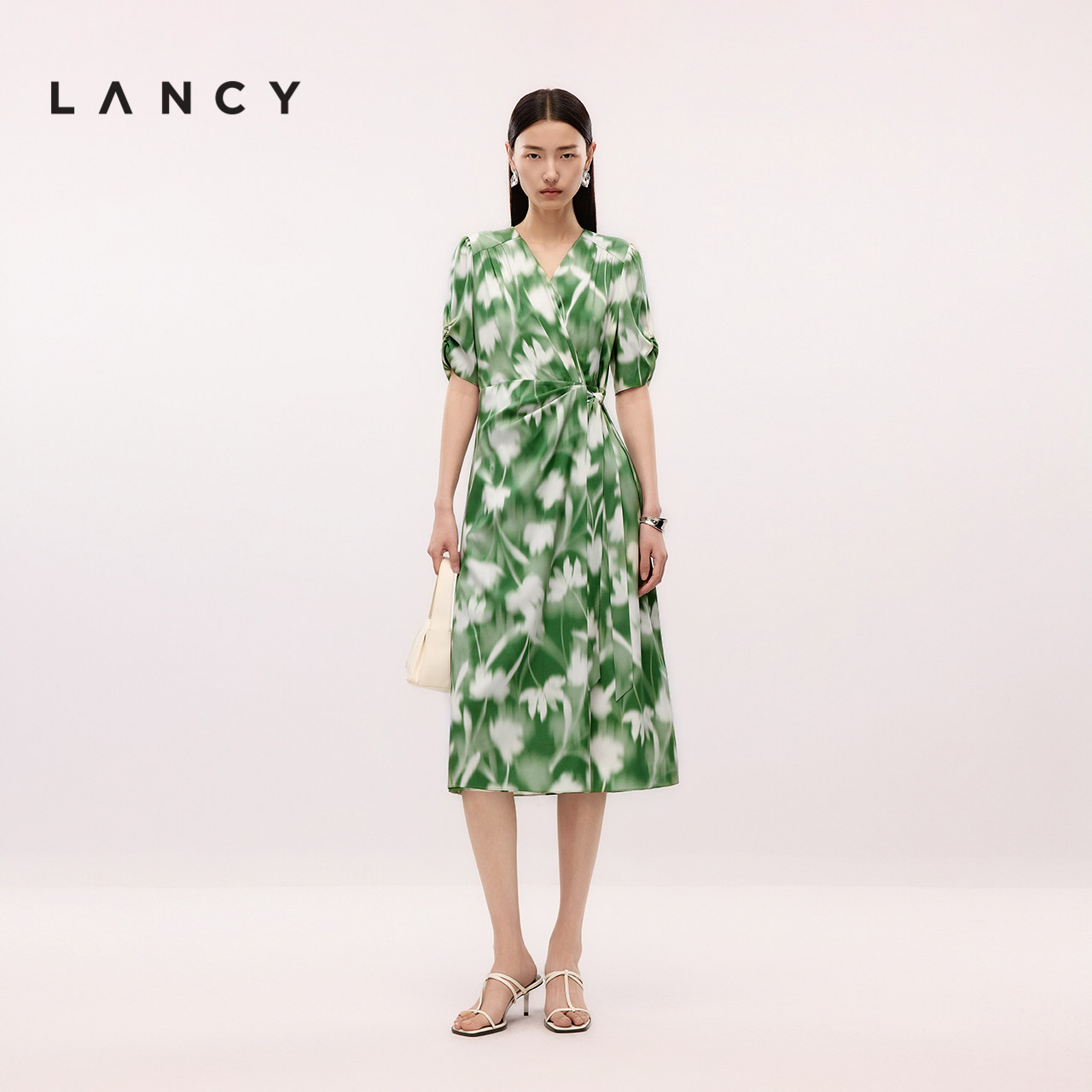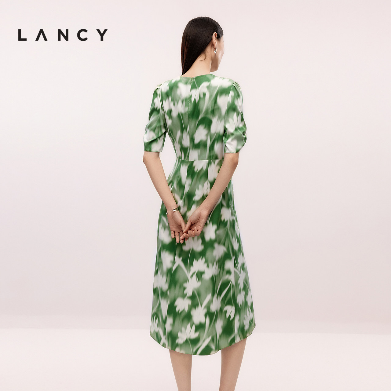 【真丝】LANCY/朗姿2025夏新款法式印花收腰短袖连衣裙气质茶歇裙
