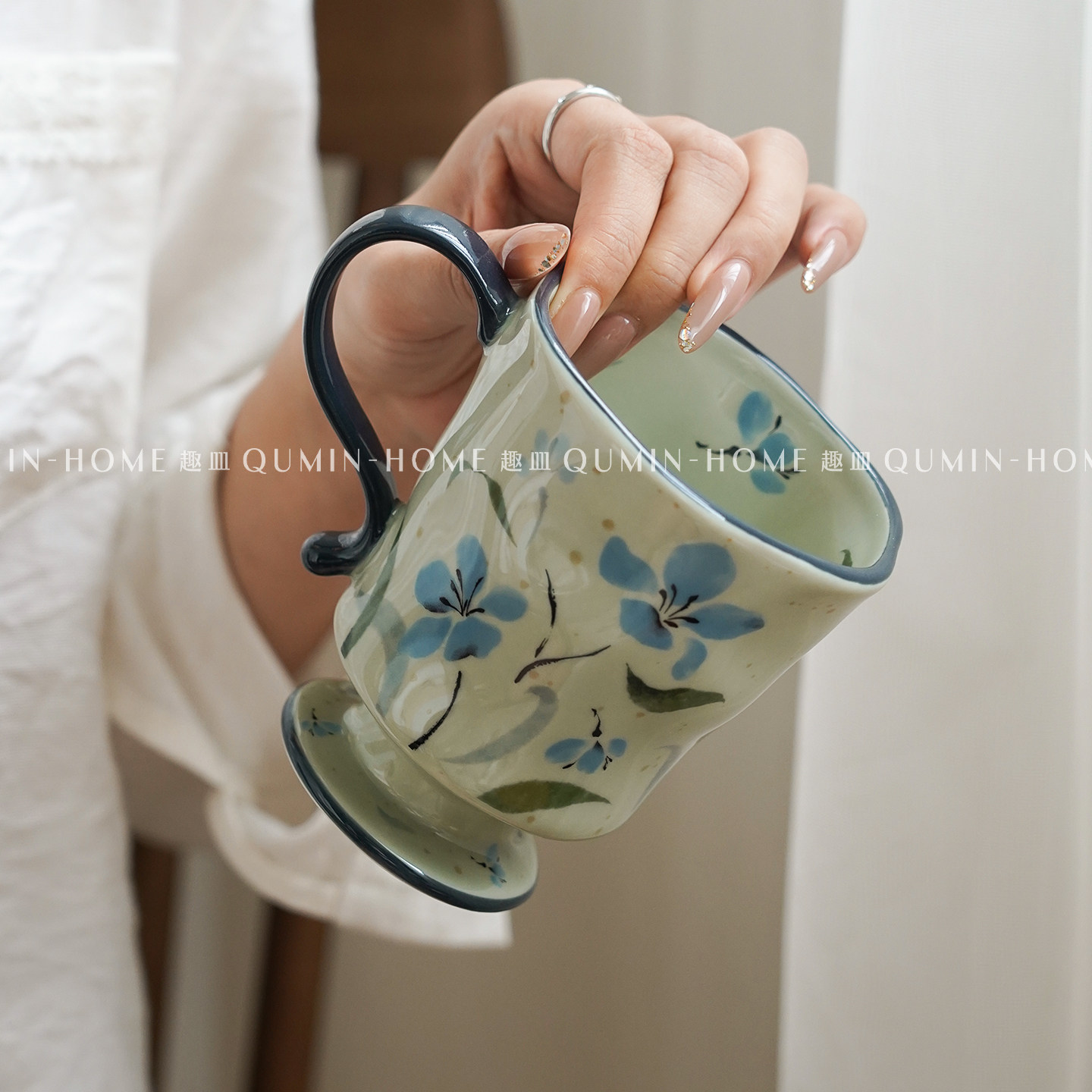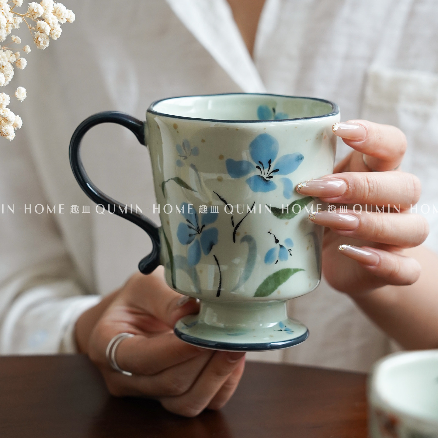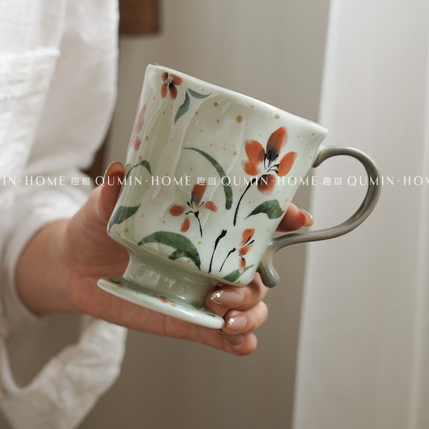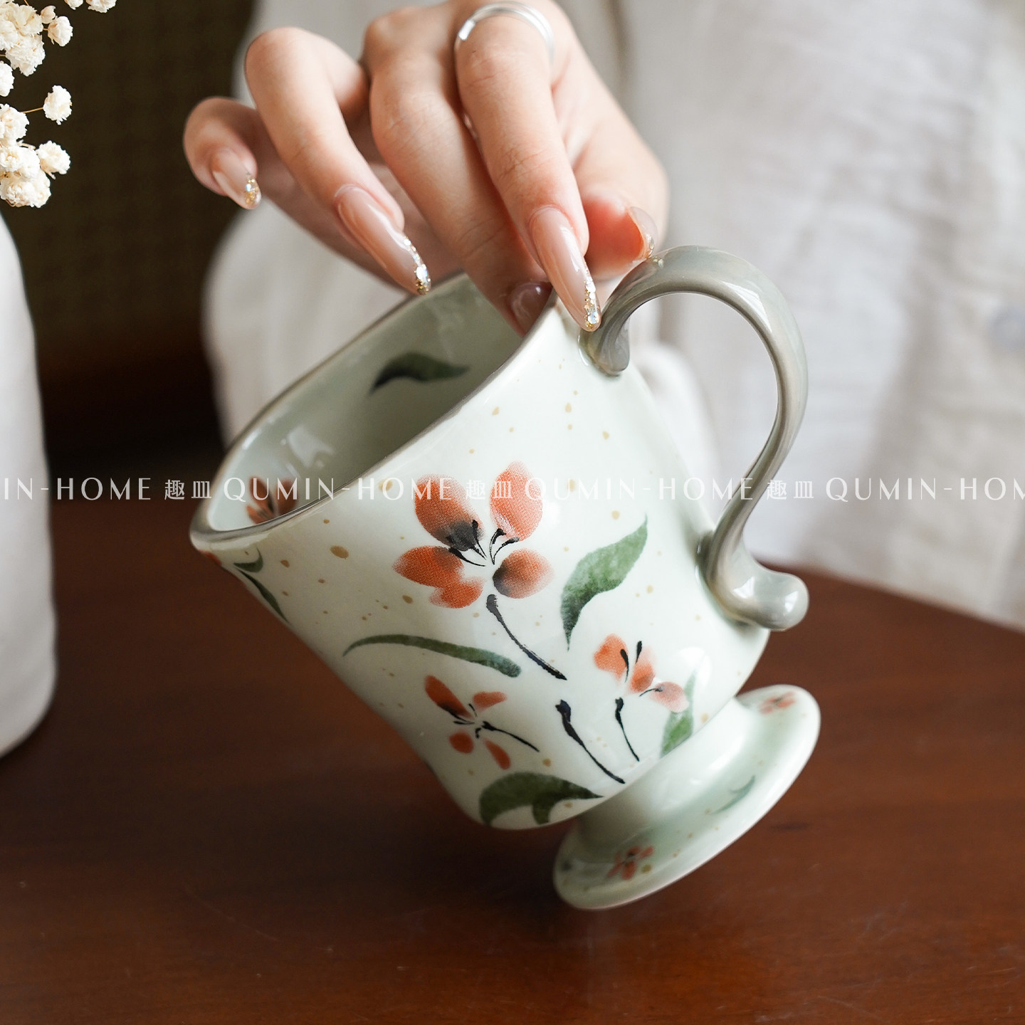趣皿设计感复古叙兰花边高脚杯陶瓷喝水杯办公室马克杯拿铁咖啡杯