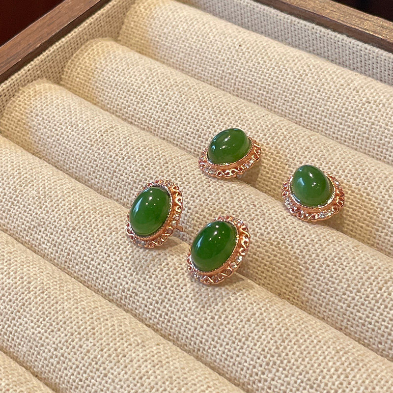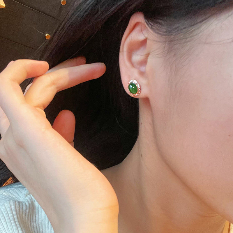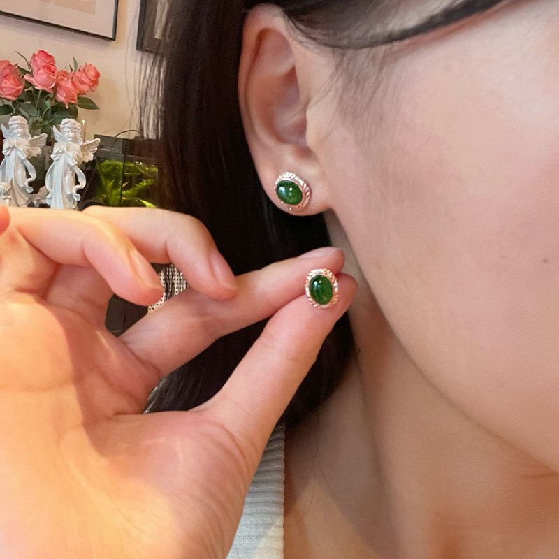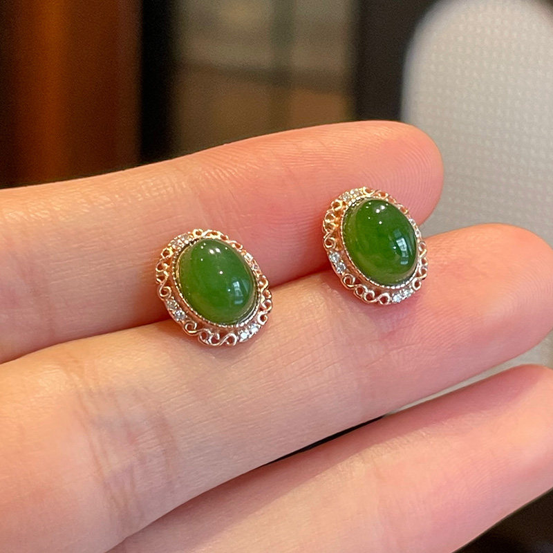 琳琯瑛和田玉耳钉复古蛋面碧玉椭圆形耳饰女轻奢高级感中式玉石