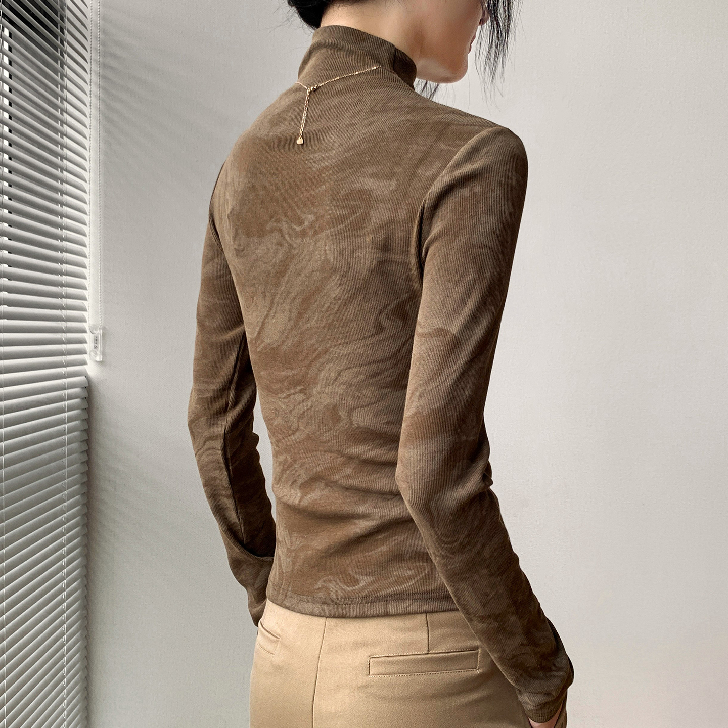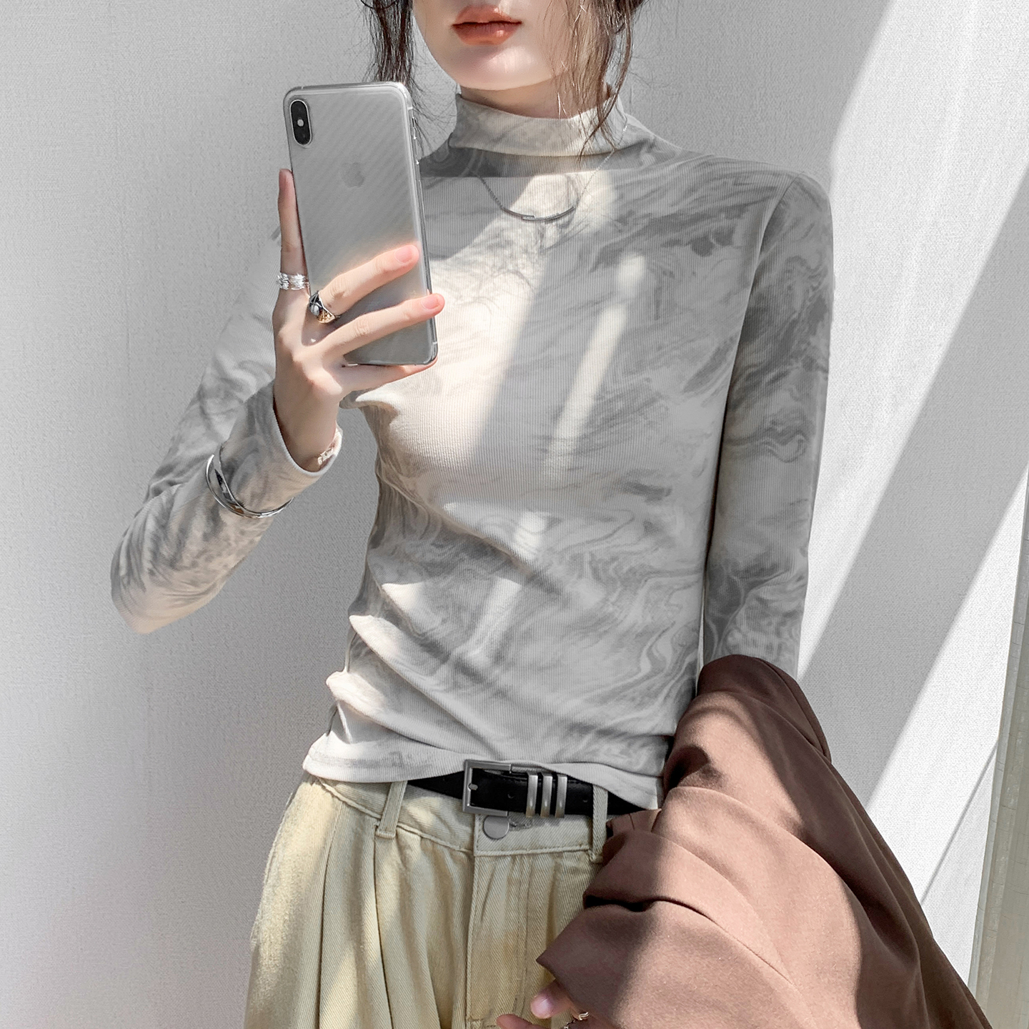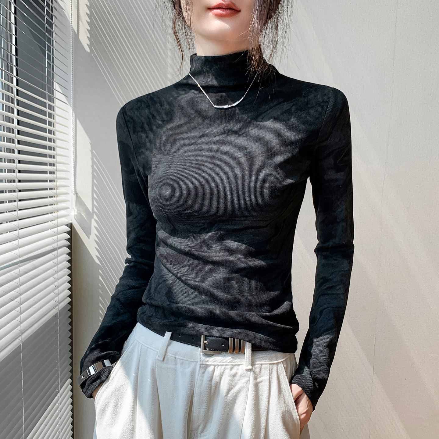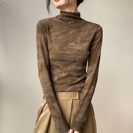 半高领长袖打底衫女2025早秋新款修身显瘦正肩内搭扎染t恤上衣
