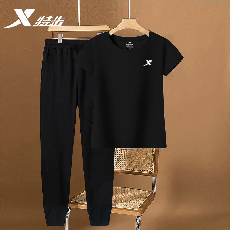特步运动套装女夏装官网旗舰短袖t恤长裤女生健身跑步紫色两件套