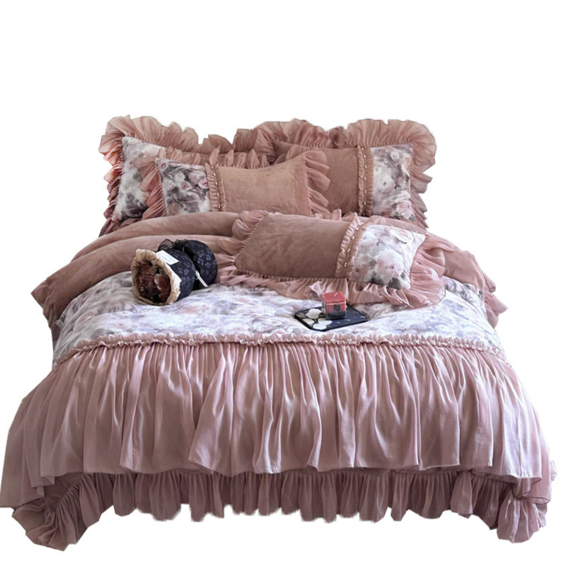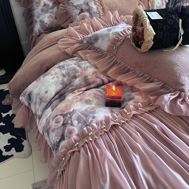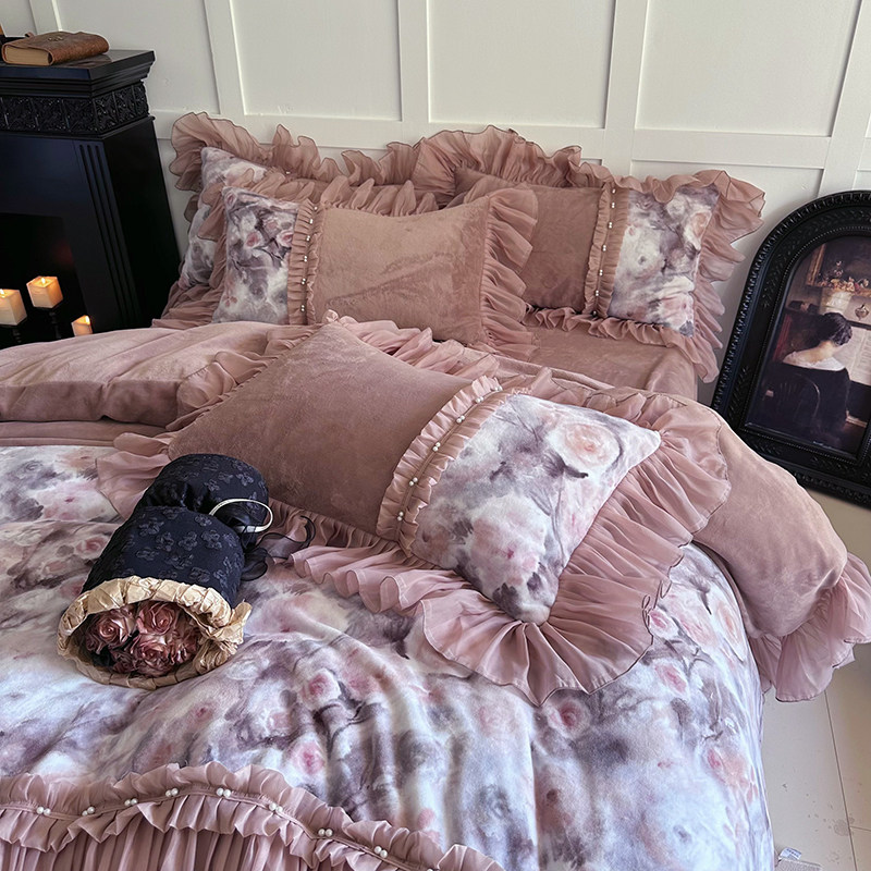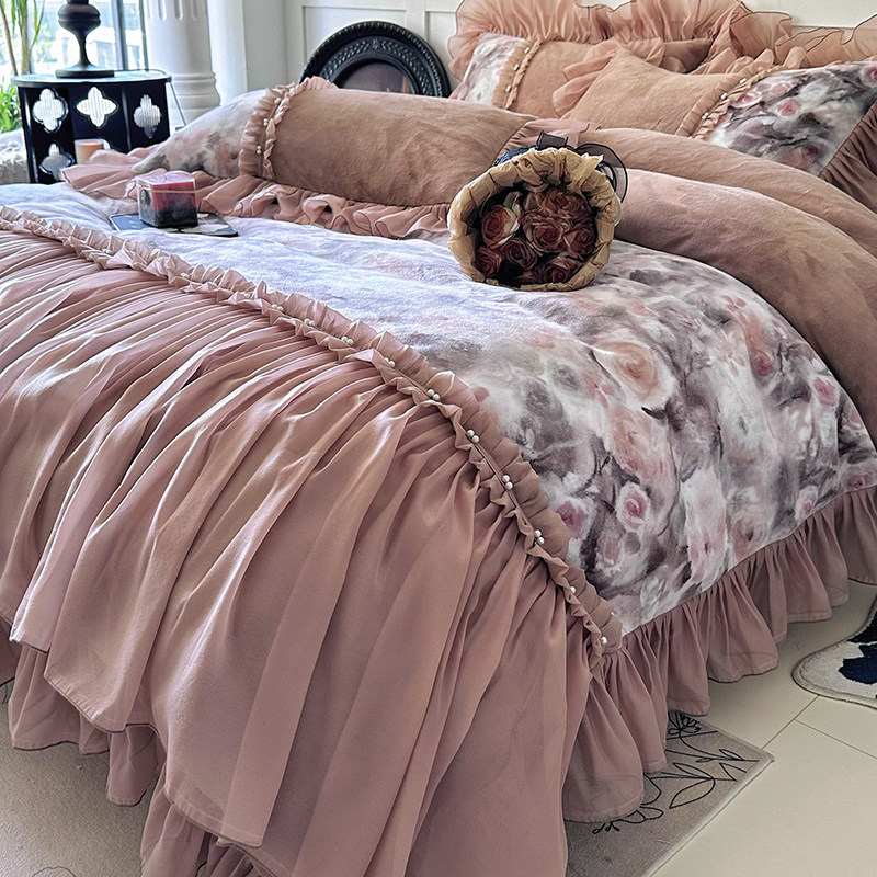 冬季法式复古公主风牛奶绒四件套珊瑚绒蕾丝花边被套加绒加厚床裙