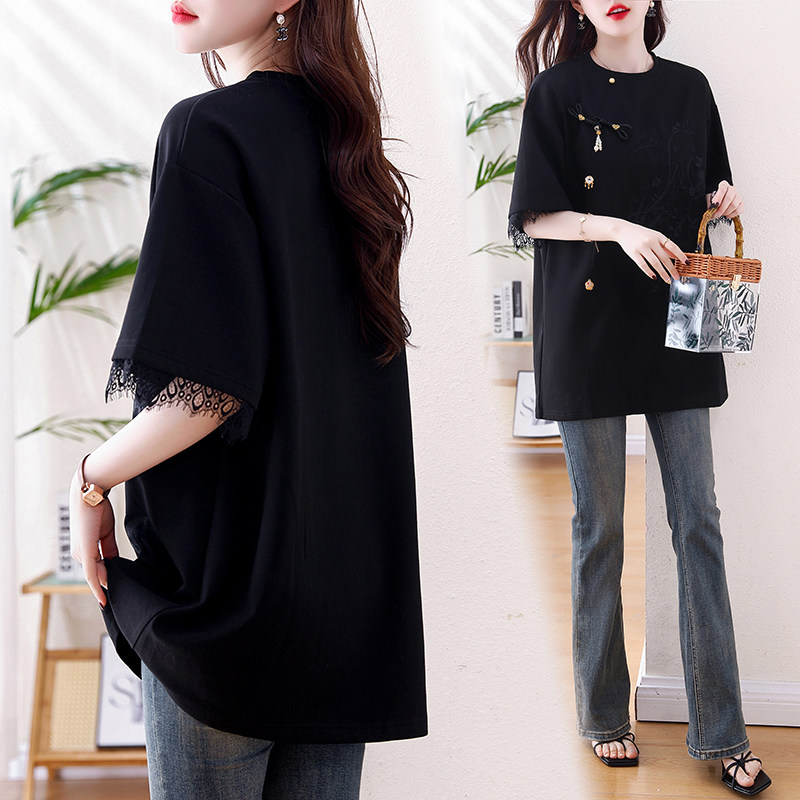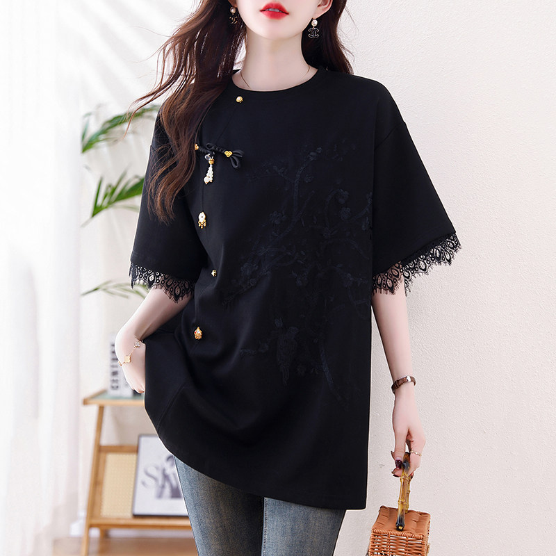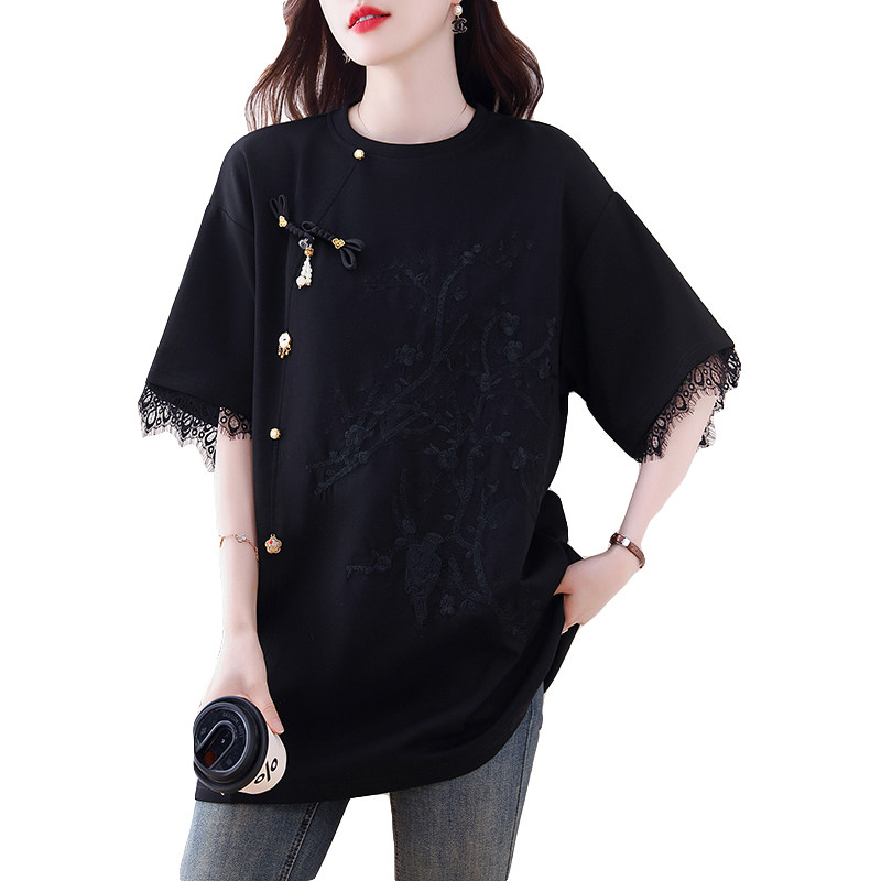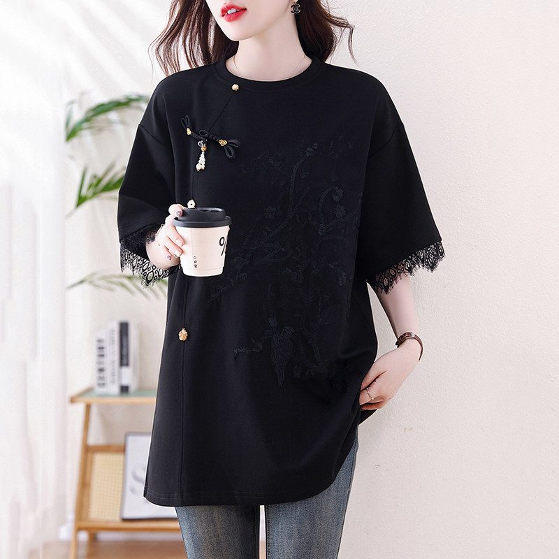 九月陌墨新中式国风大码T恤女短袖2025夏季新款宽松显瘦刺绣上衣