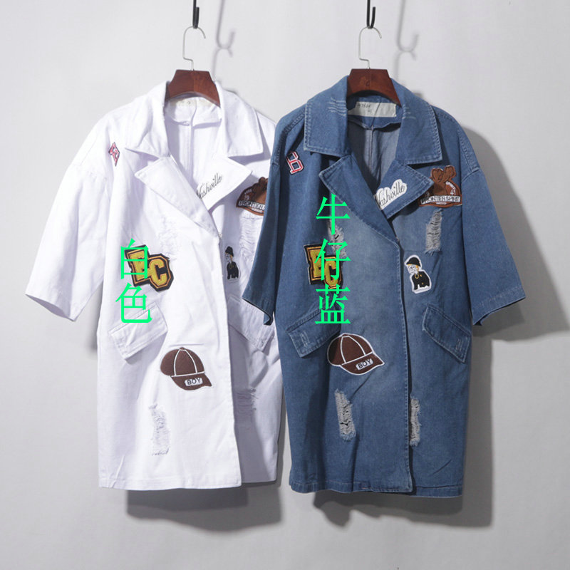 女装磨破贴布中长款中袖牛仔外套女春秋欧货爆款bf风水洗上衣大码