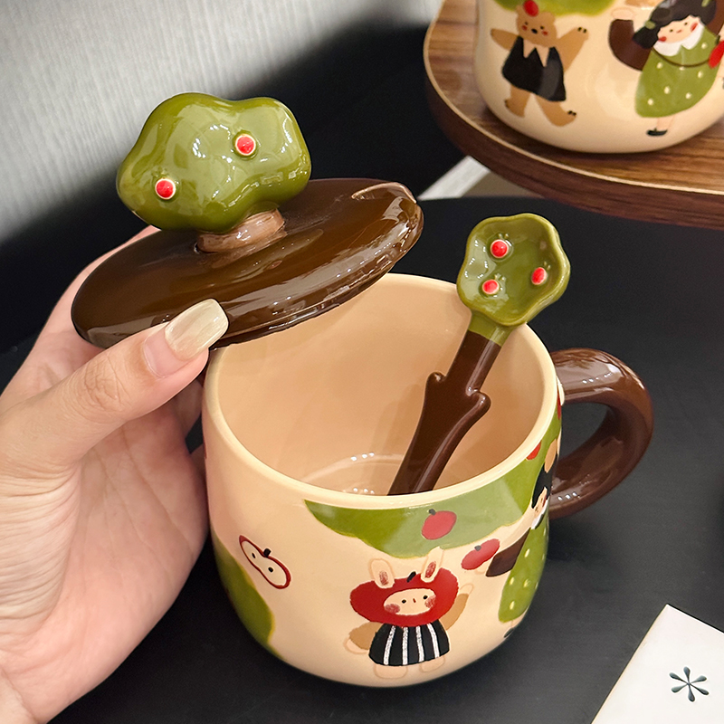 可爱苹果树女生马克杯带盖勺超萌高颜值陶瓷喝水杯子艺术感咖啡杯