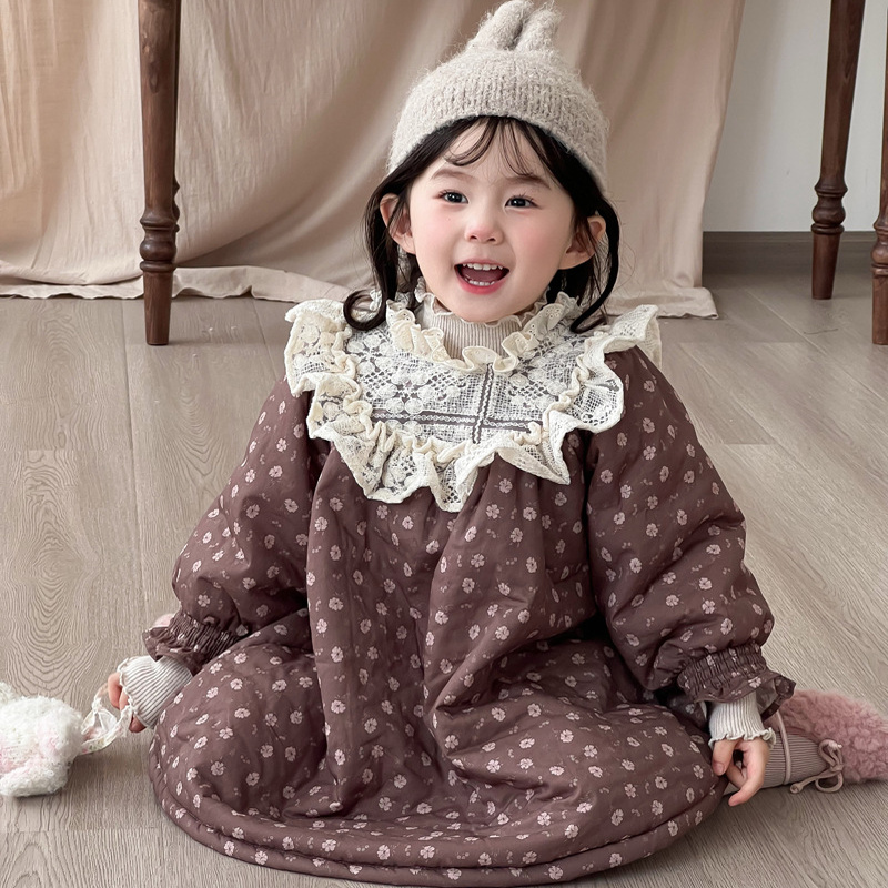 童装秋冬新款女童夹棉加厚碎花连衣裙儿童韩版拼蕾丝花边领棉裙