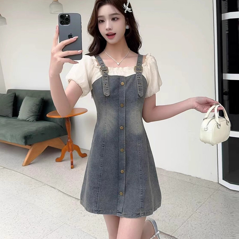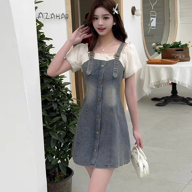 牛仔吊带拼接连衣裙女式夏季短袖