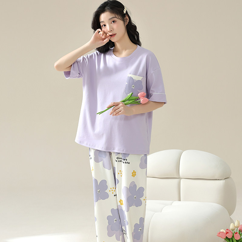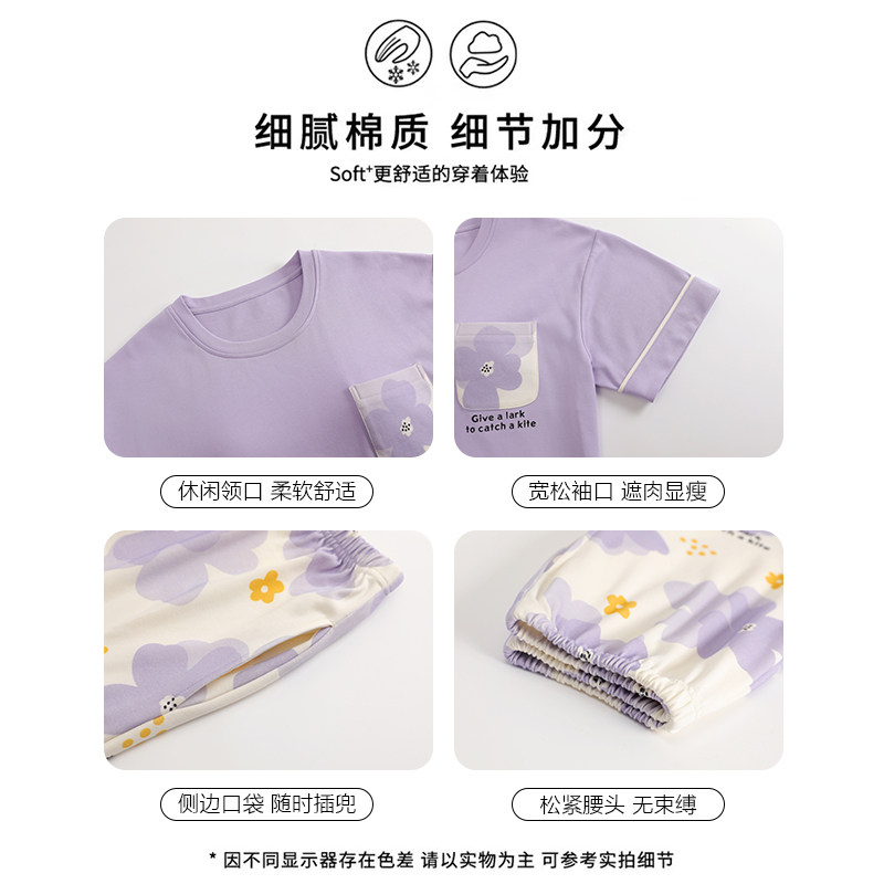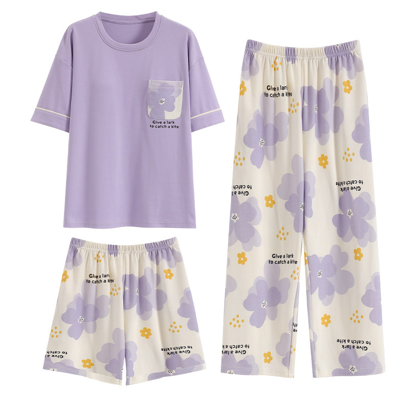 浪莎带胸垫睡衣女夏季纯棉短袖长裤可外穿宽松休闲家居服三件套装