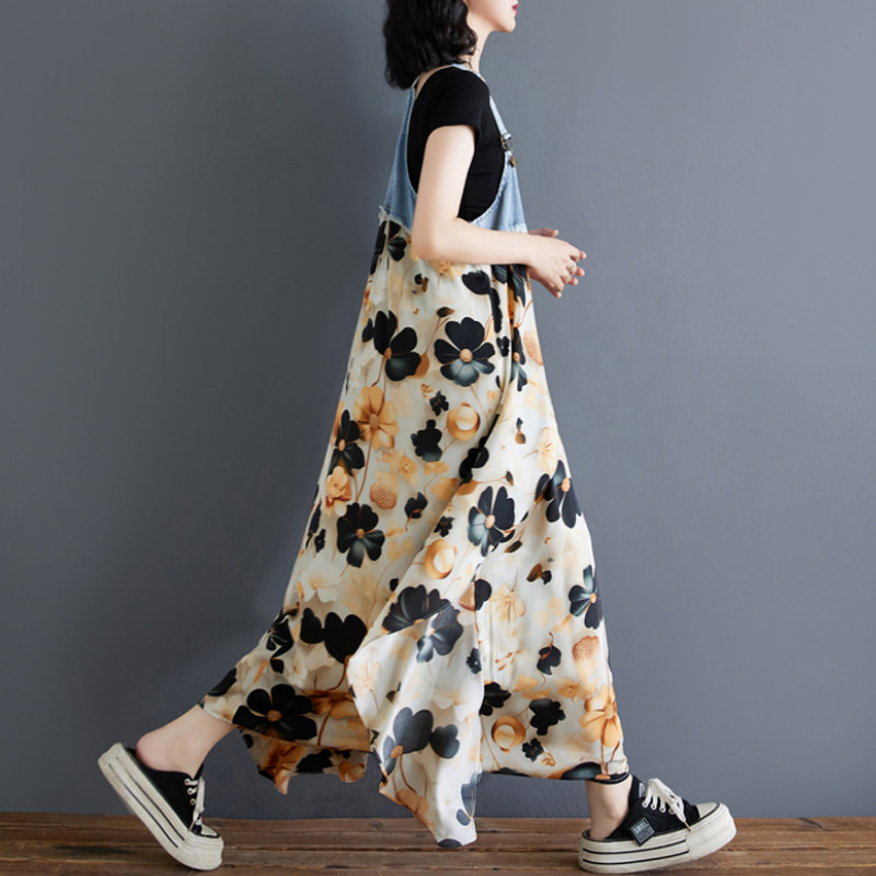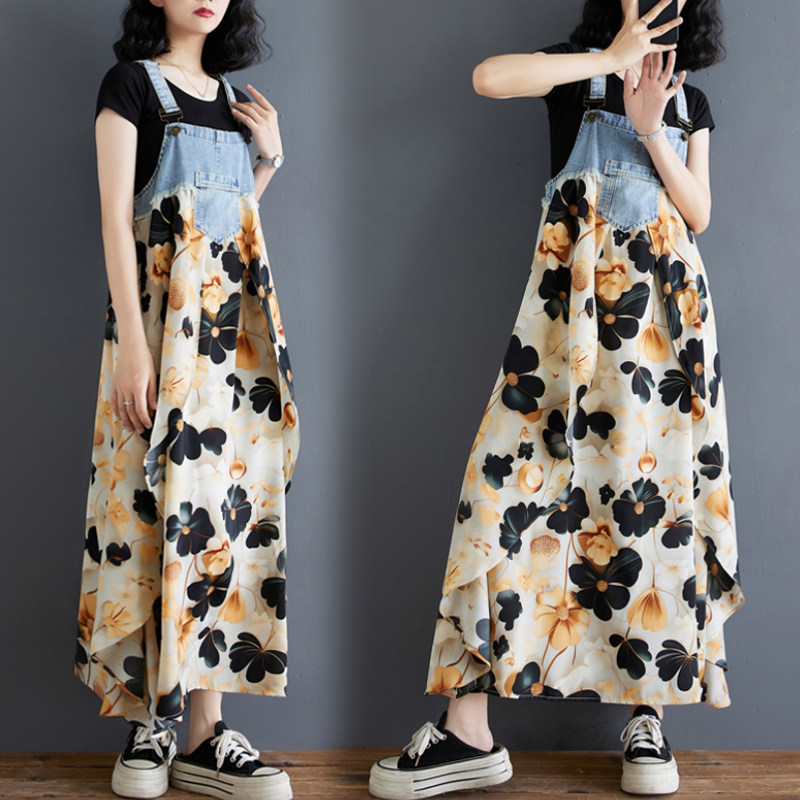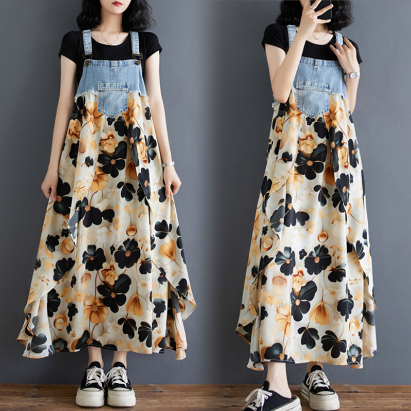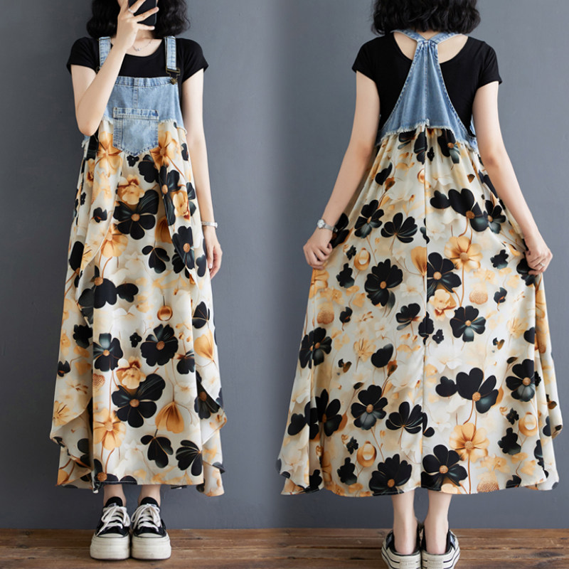 花裙子高腰夏装新款荷叶边宽松雪纺牛仔设计感背带中长款连衣裙