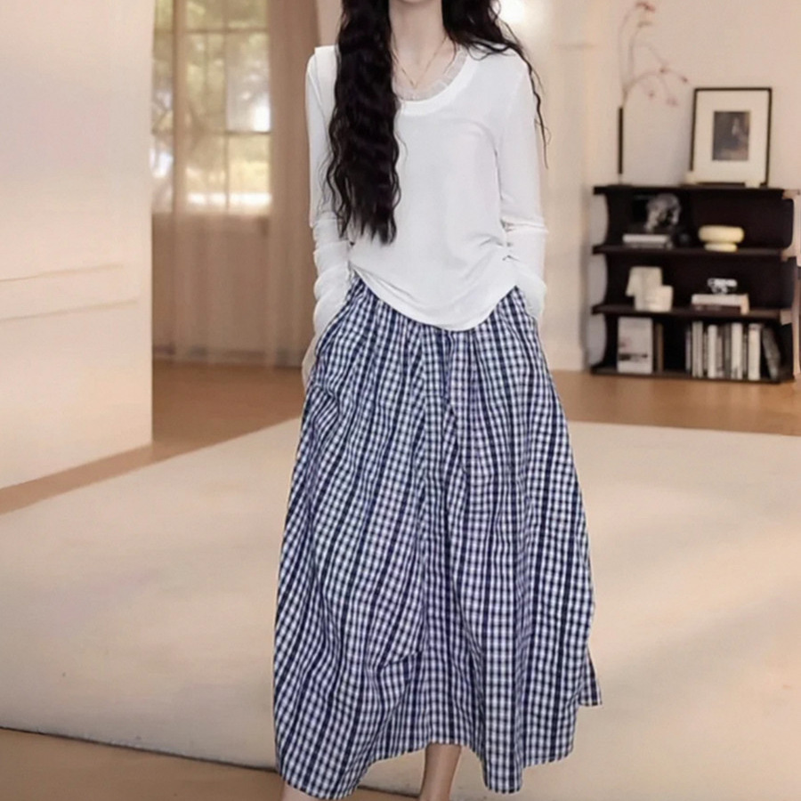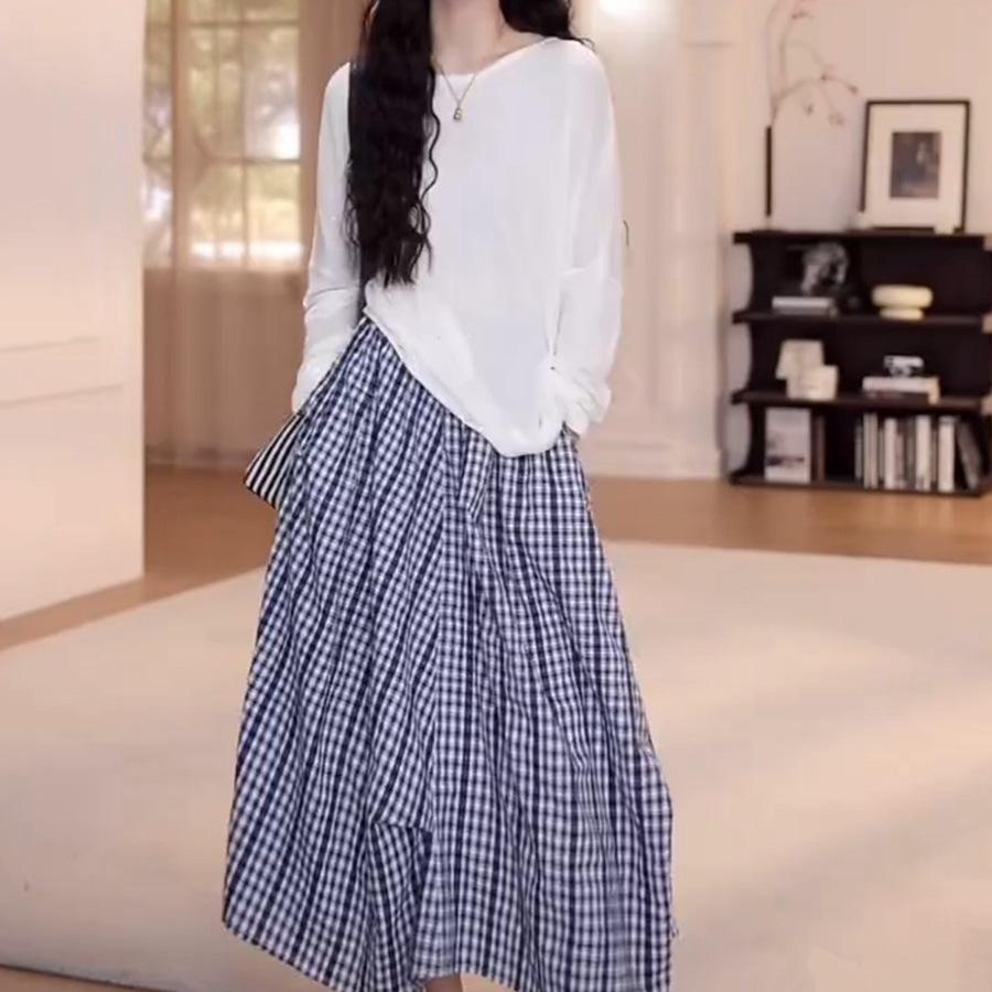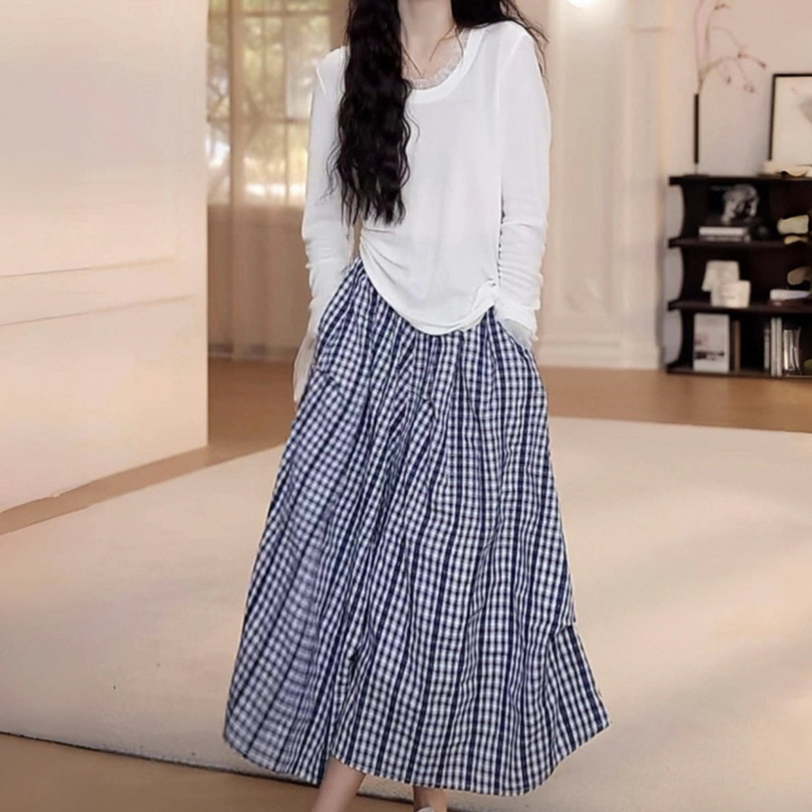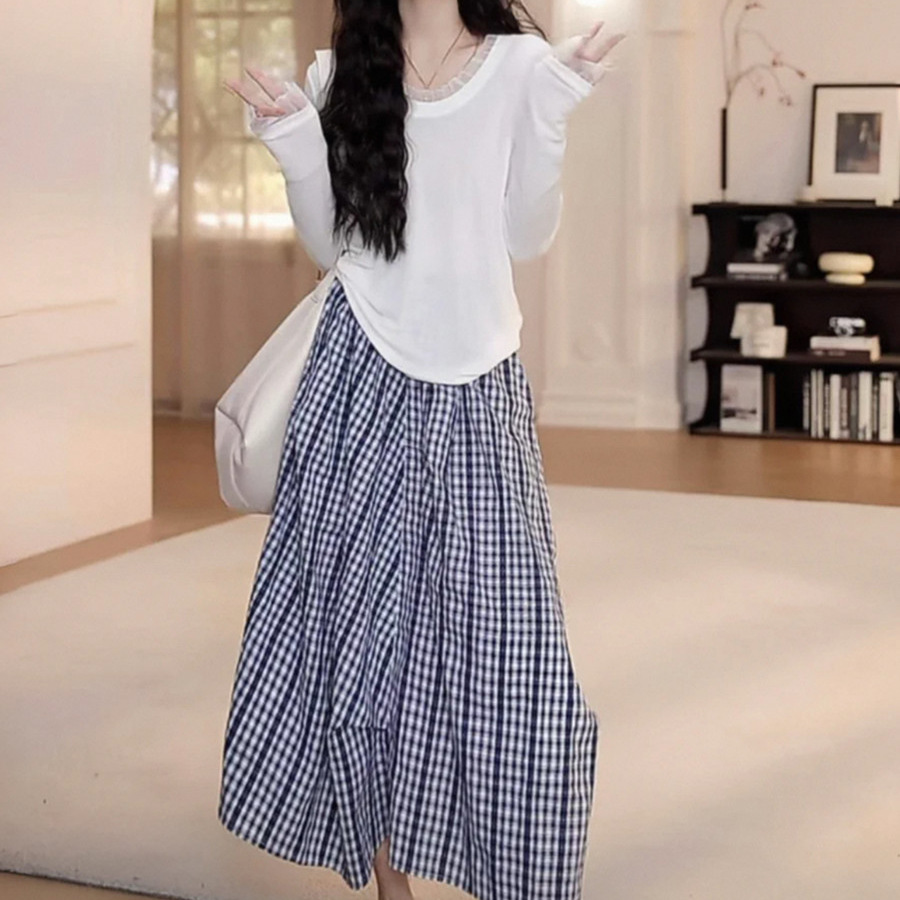 韩系穿搭一整套女蕾丝花边长袖T恤松紧腰不规则格子半身裙两件套