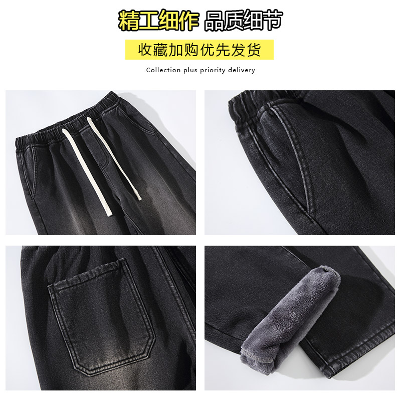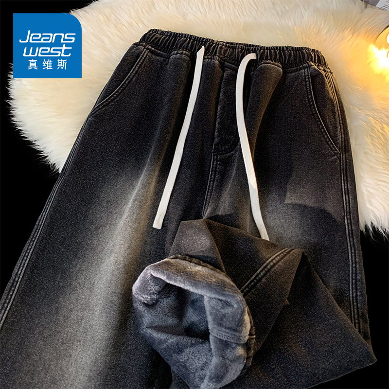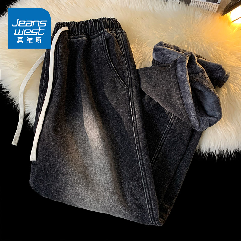 KZ真维斯冬季纯色简约休闲百搭黑色牛仔裤子男美式高街抽绳长裤男