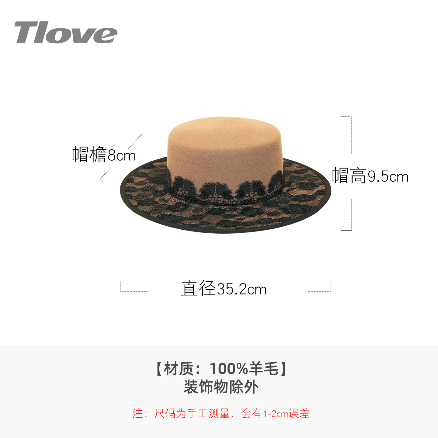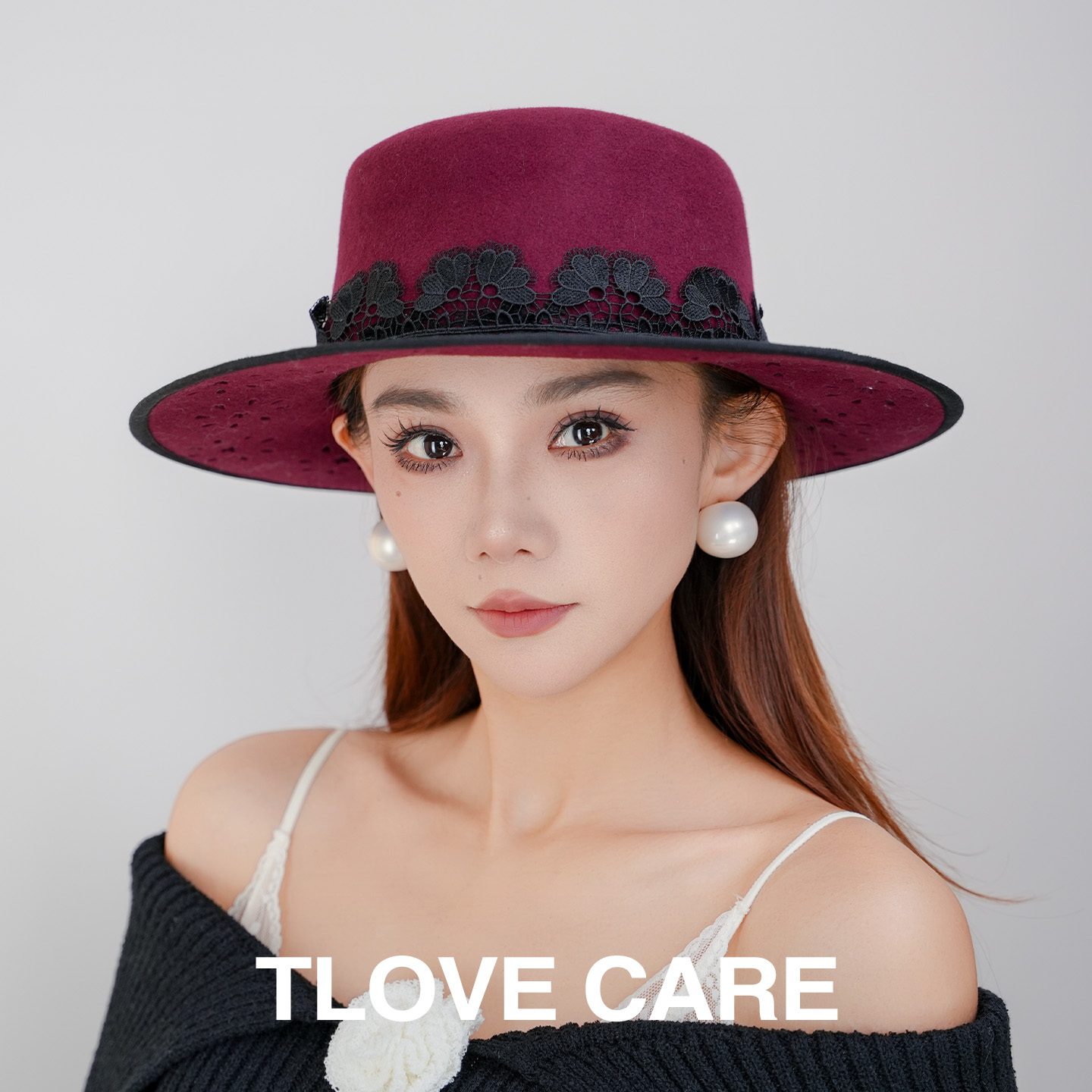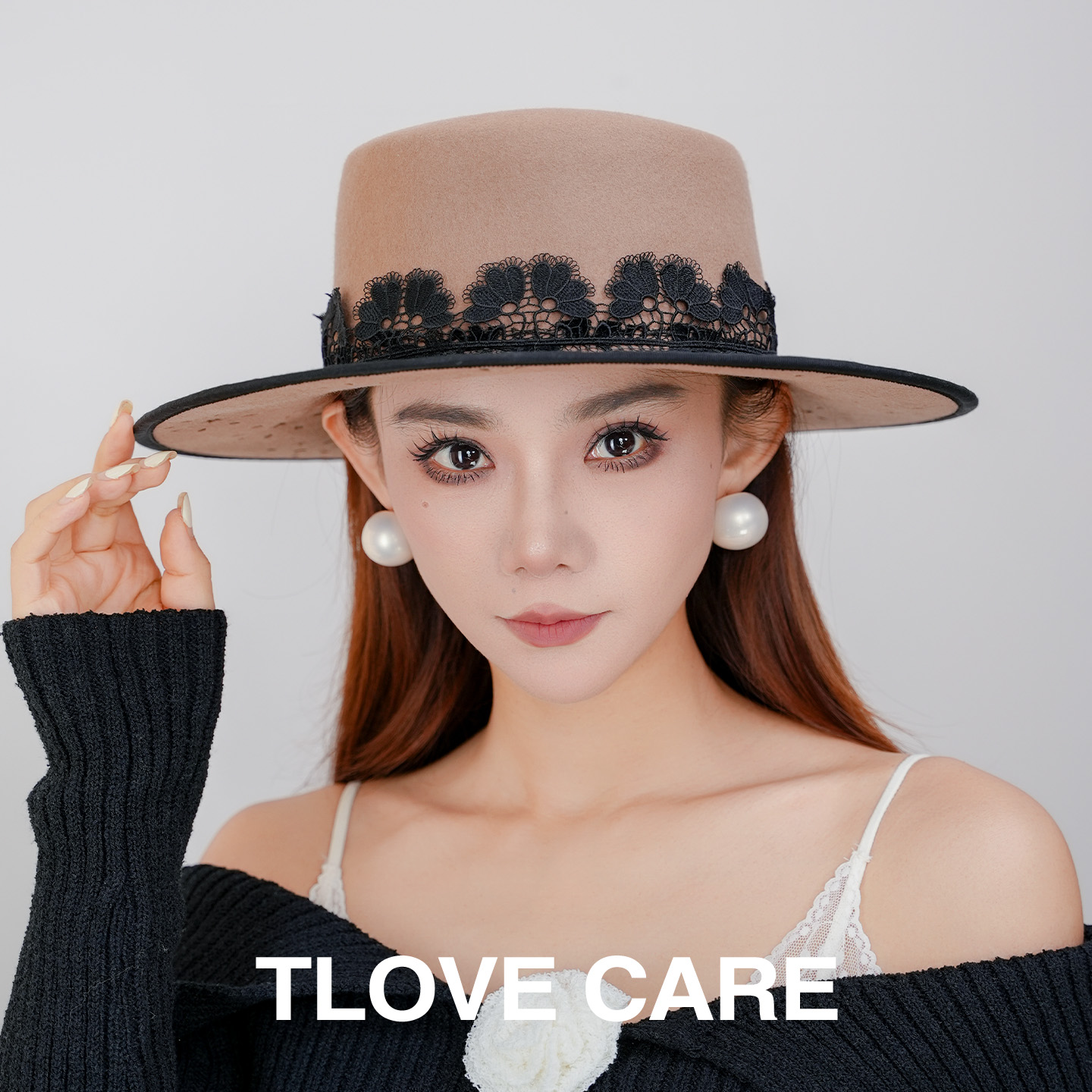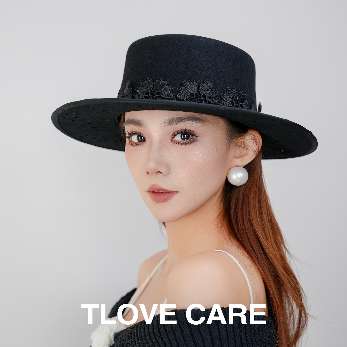 9669优雅洋气平沿帽女士秋冬季新款名媛范羊毛毡帽子户外大檐礼帽