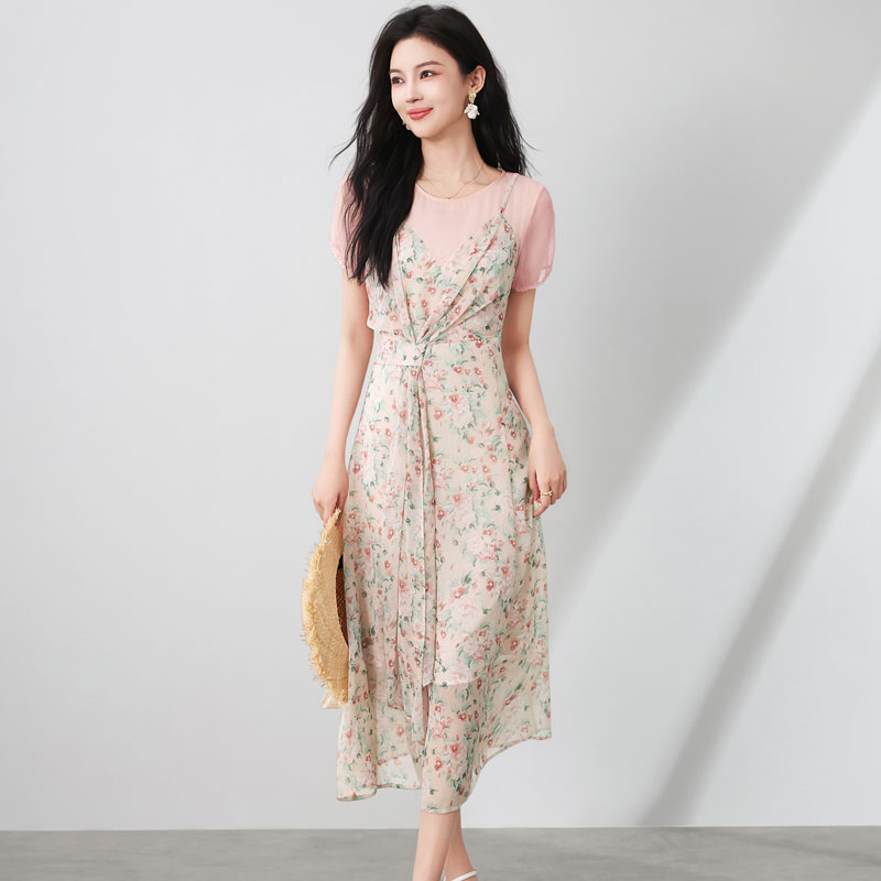 迪奥法式连衣裙女夏25新款气质假两件碎花裙浪漫唯美短袖中长裙子