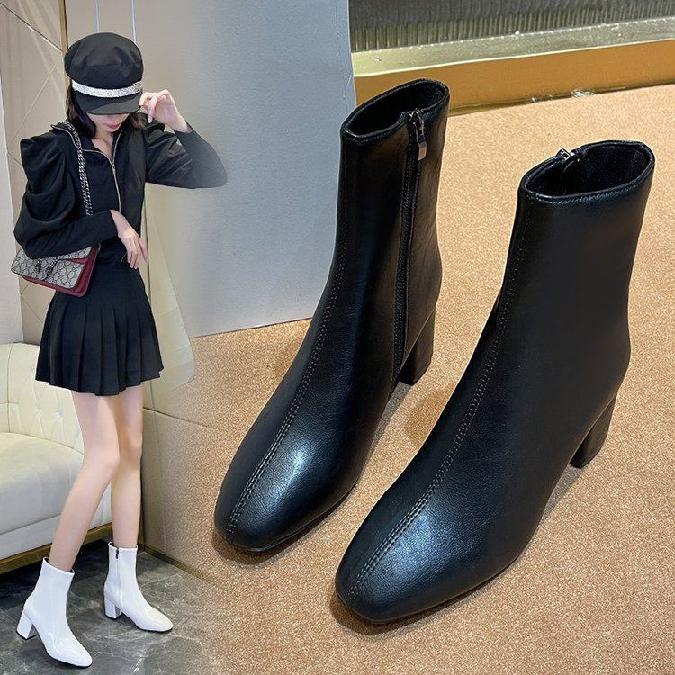 5cm短靴女新款白色粗跟马丁靴女软皮时尚春秋单靴高跟方头瘦瘦靴