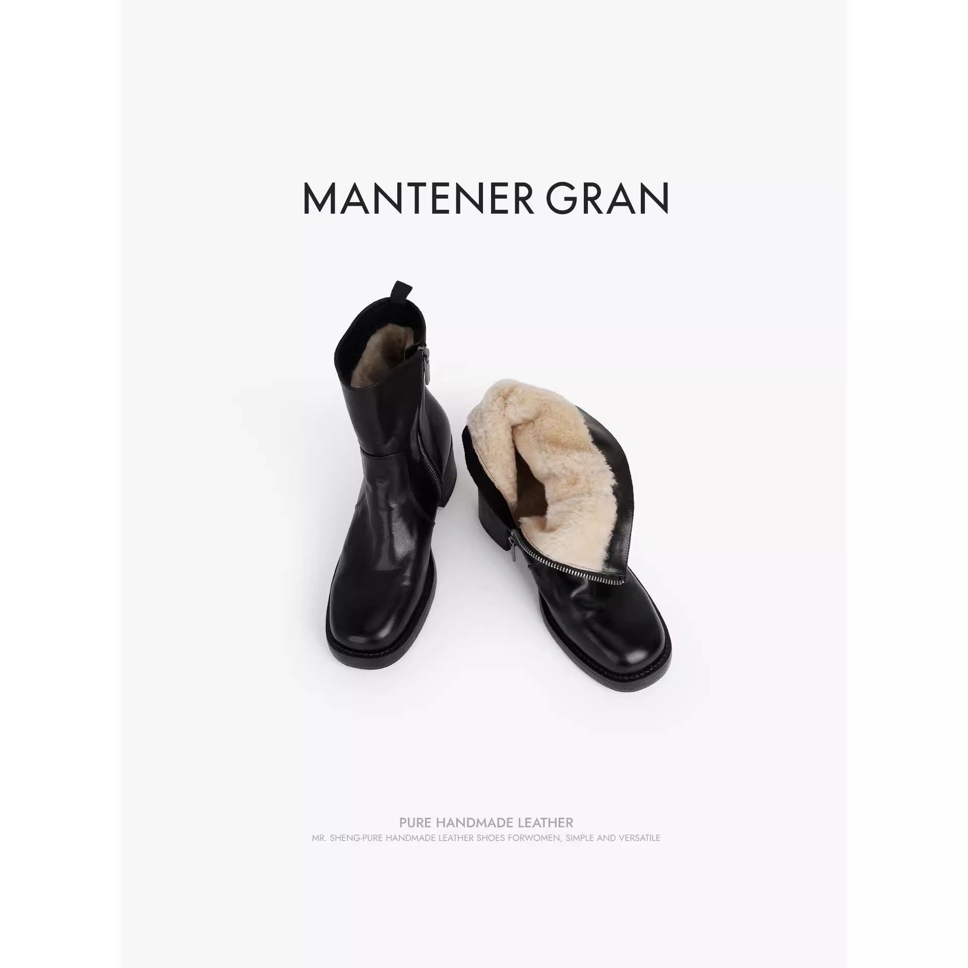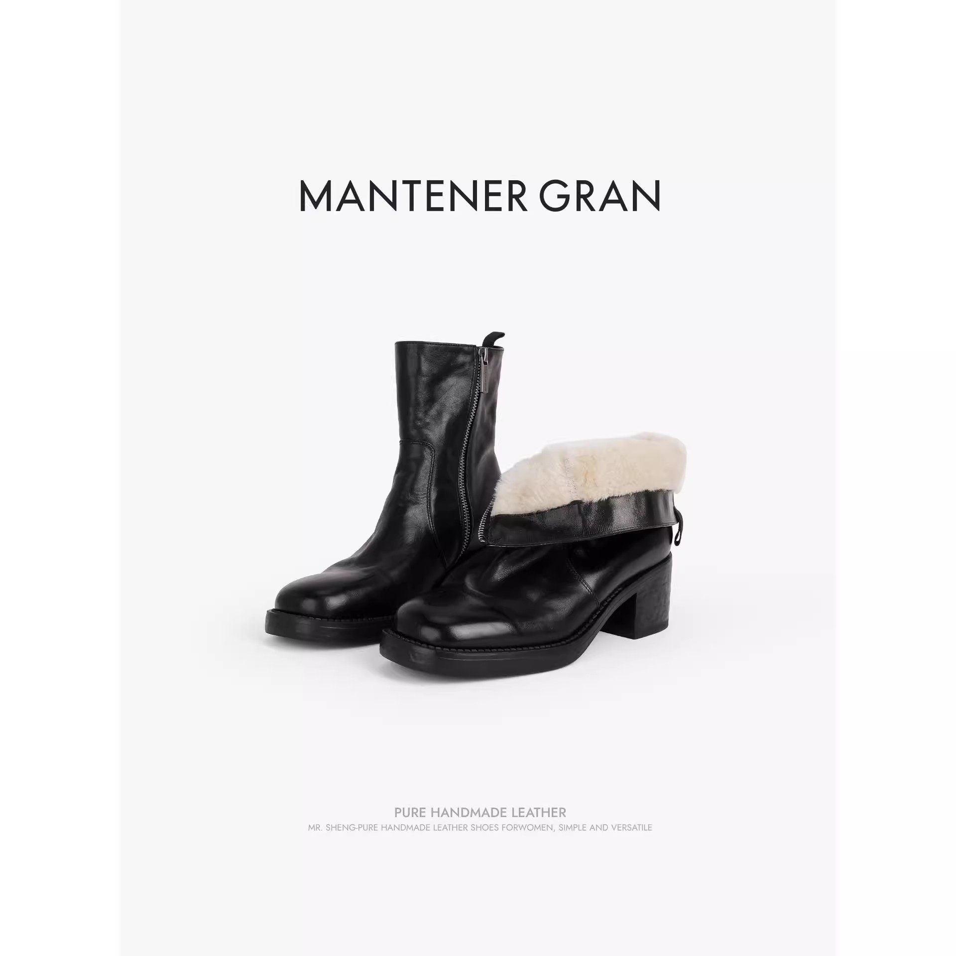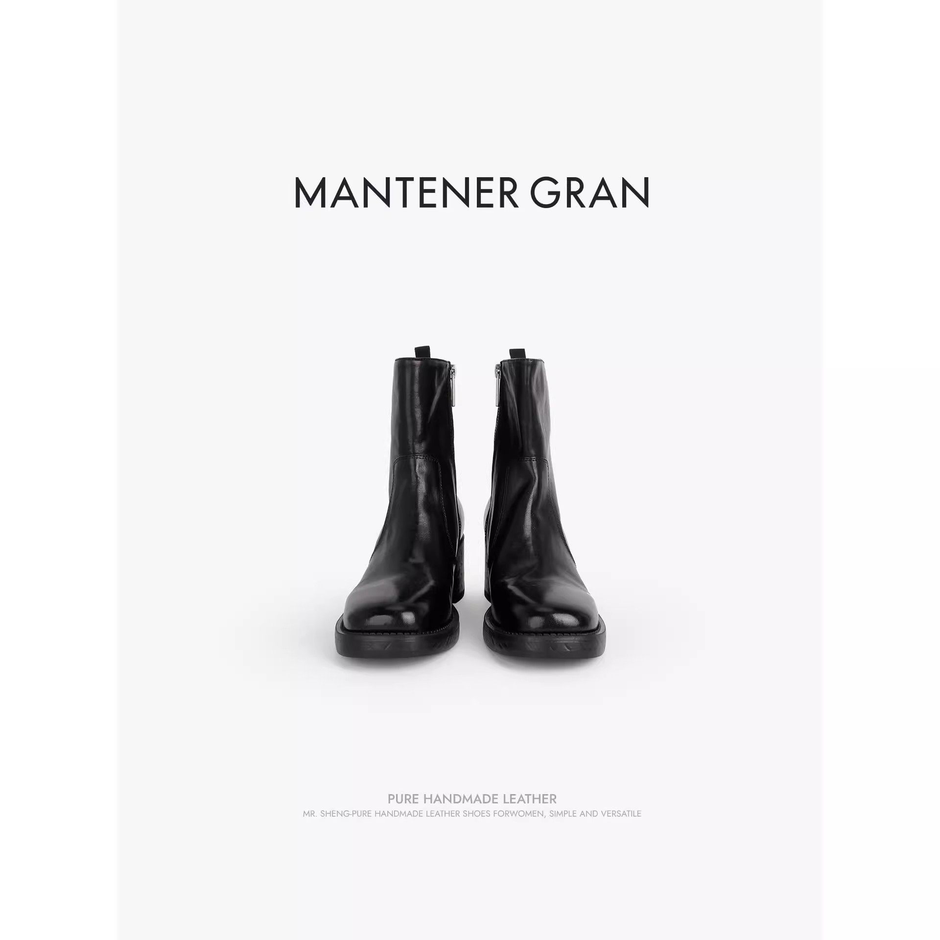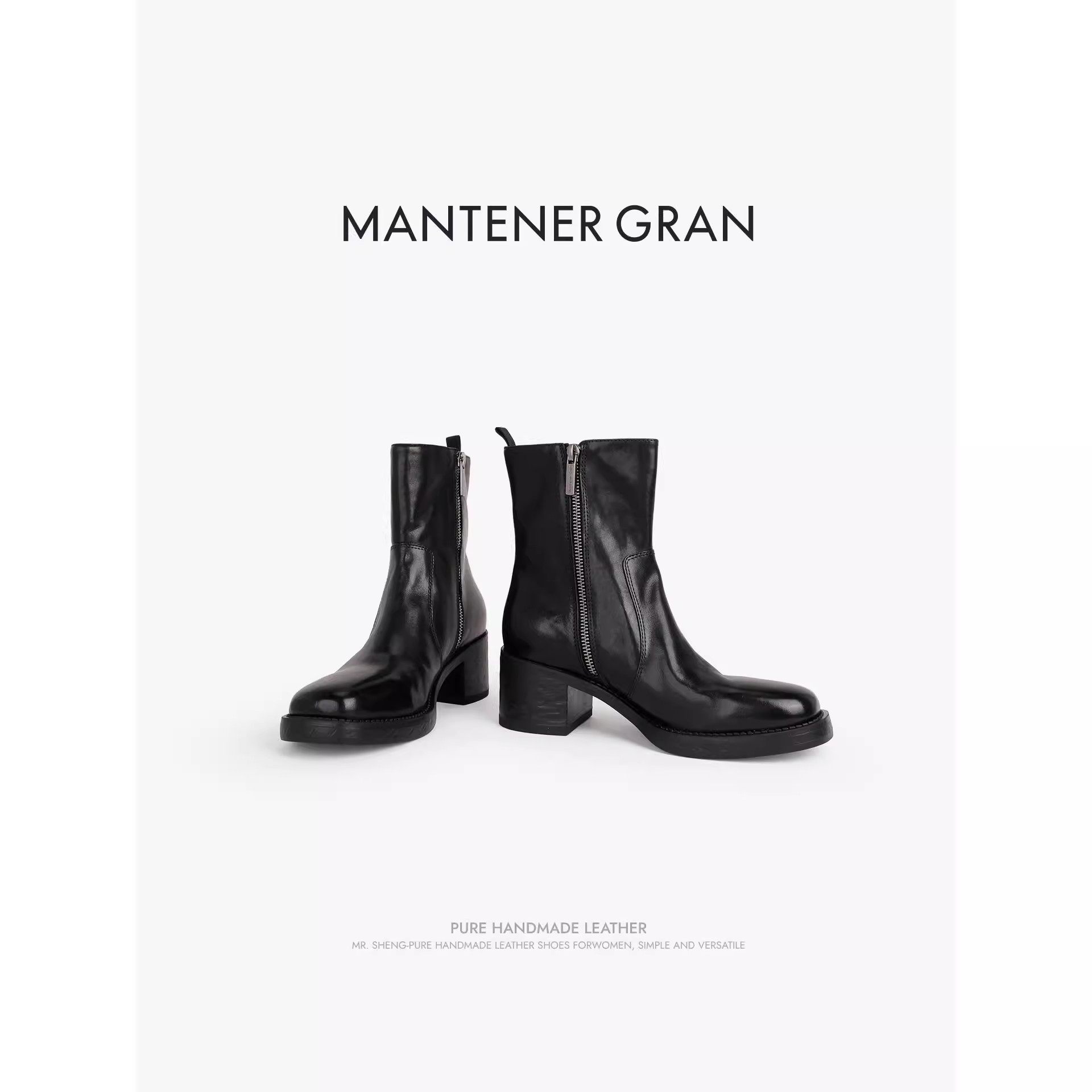 MantenerGran高跟粗跟靴子女黑色真皮加绒短靴英伦风马丁靴MG女鞋