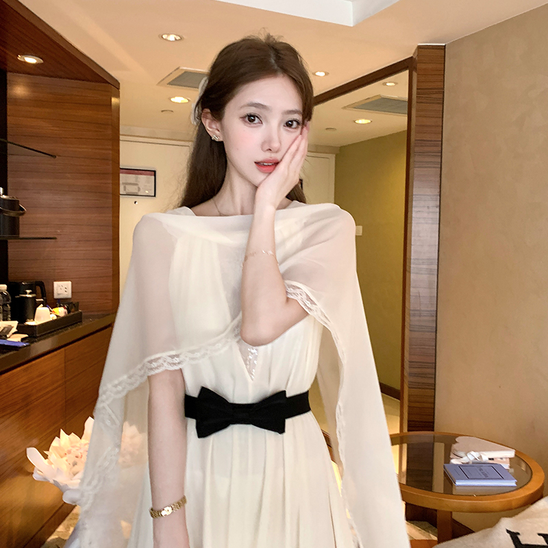 Acaine纯色长款收腰网纱披肩吊带连衣裙女夏季法式复古气质裙子
