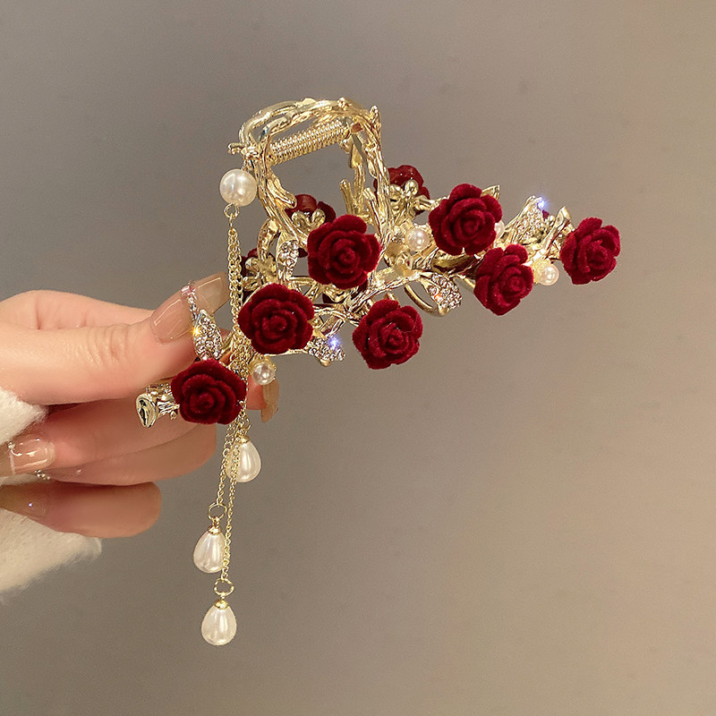 红色玫瑰流苏抓夹女2024新款