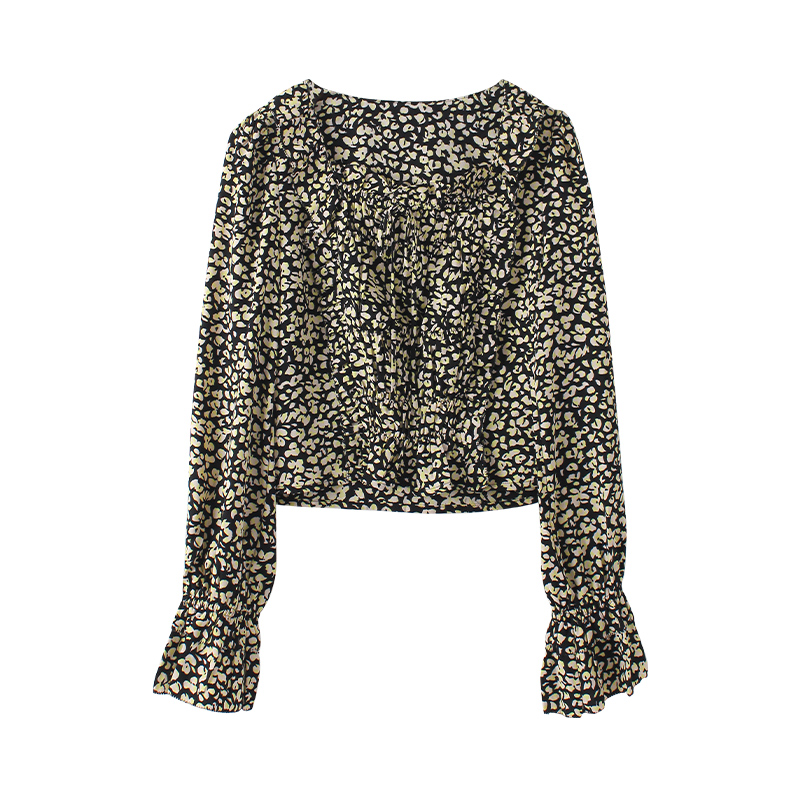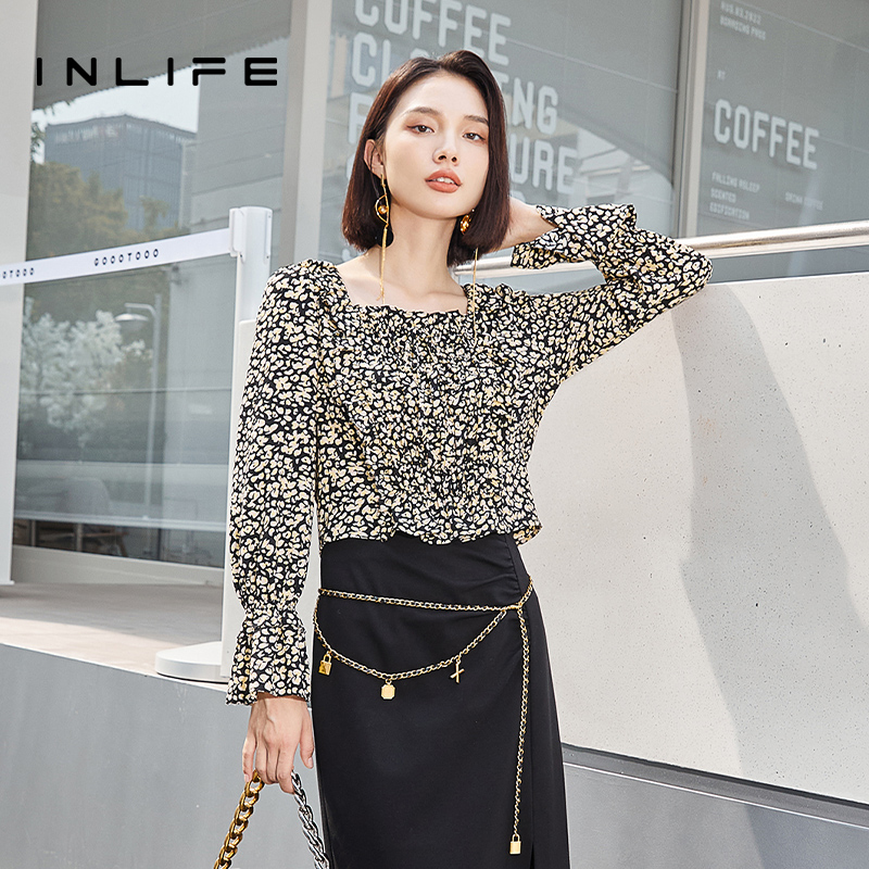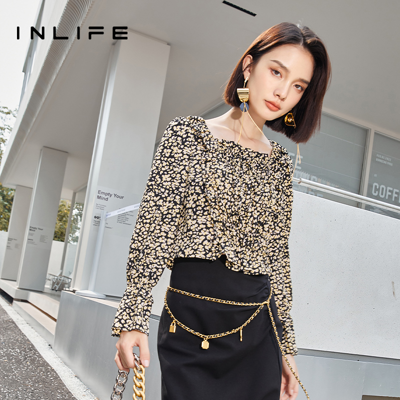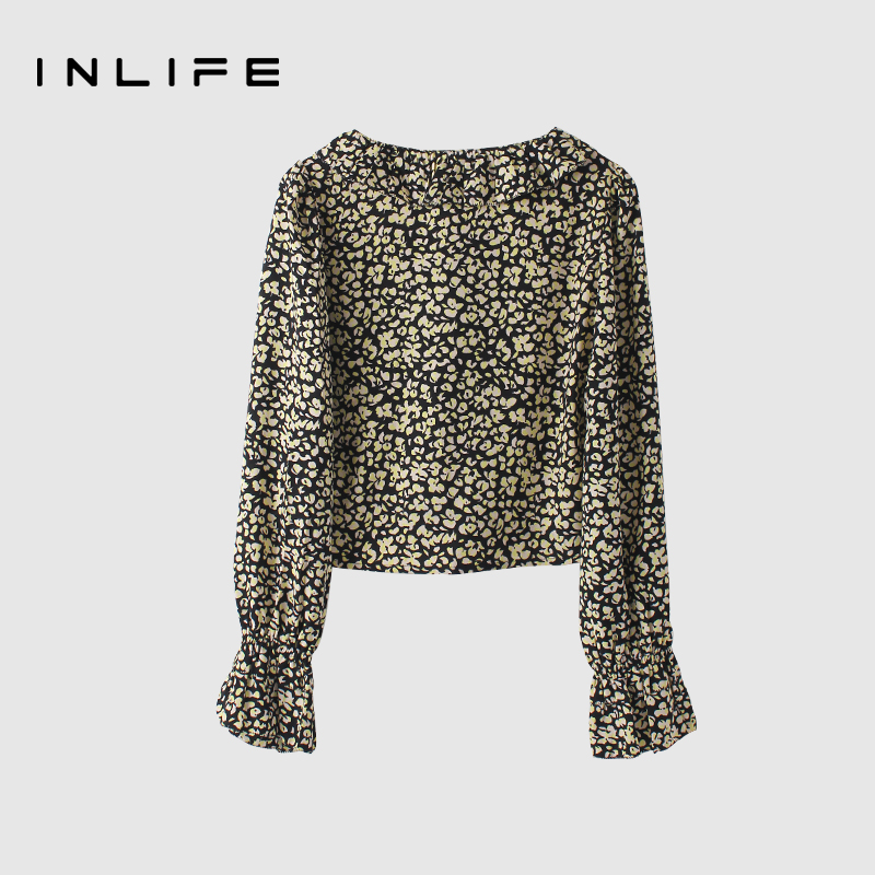 伊纳芙时尚复古碎花衬衫女2025春季新款休闲收腰小衫短款印花上衣