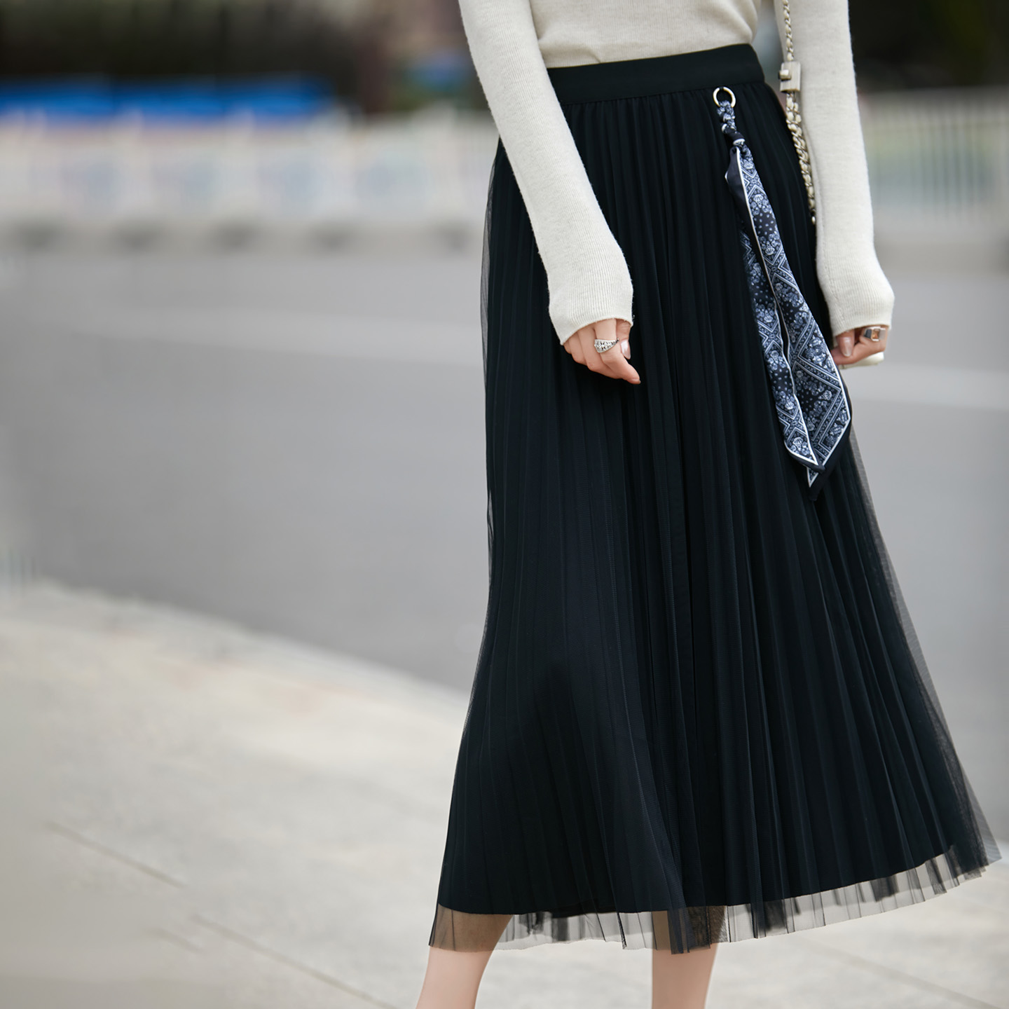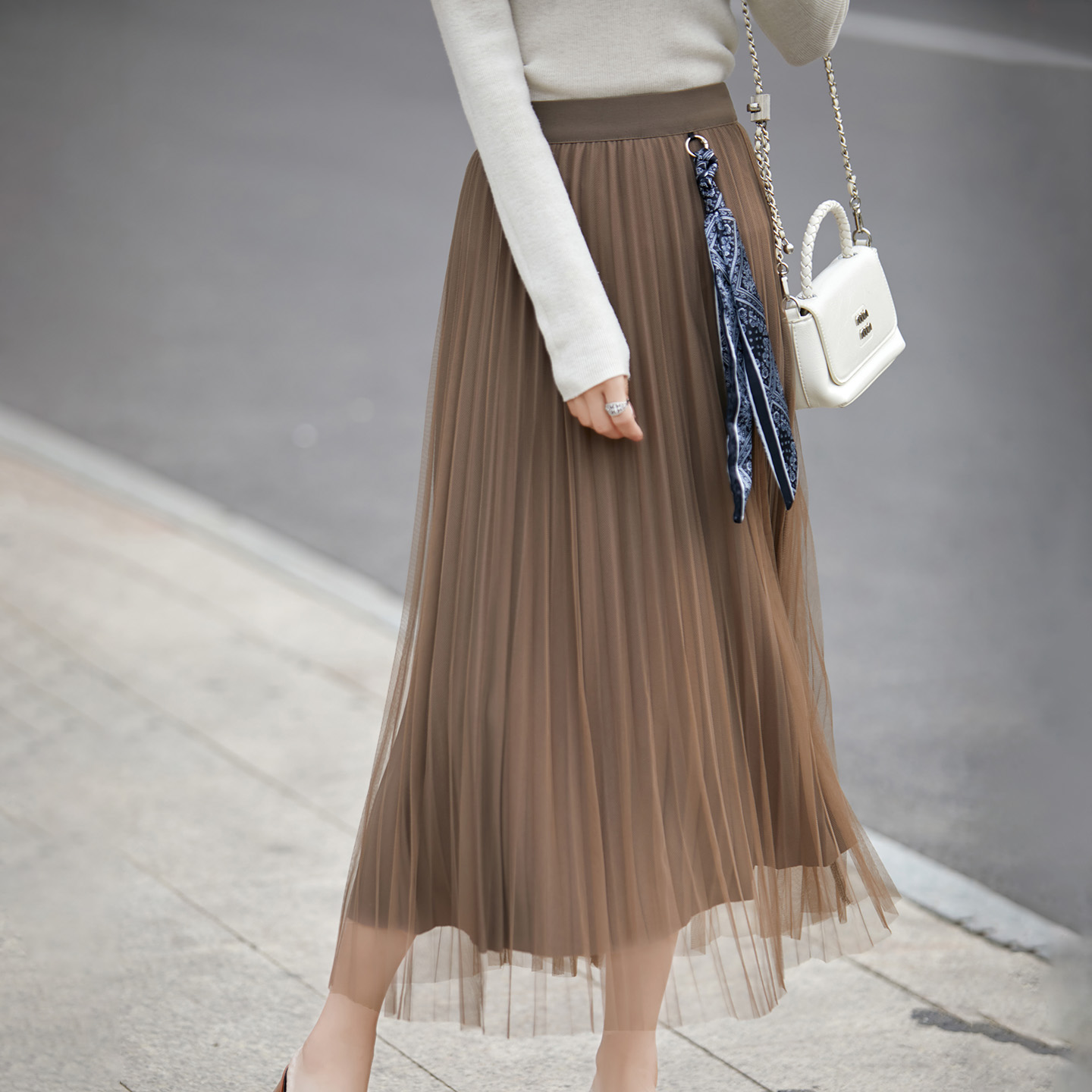 百褶半身裙女高腰显瘦遮跨大摆锤气质百搭中长款伞裙A字网纱裙