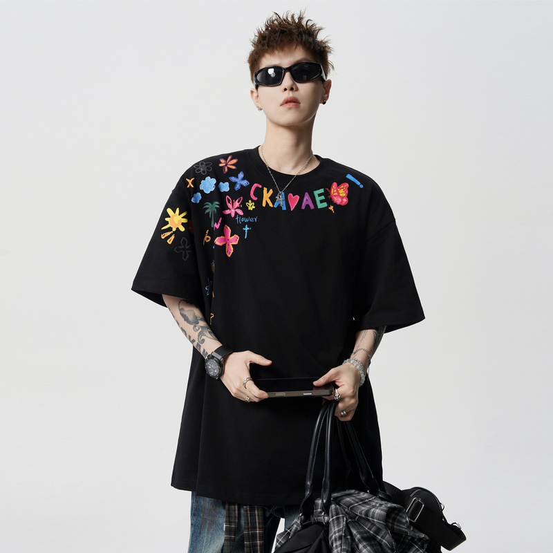 悟空有货美式设计感手绘印花圆领短袖T恤男夏季宽松百搭情侣体恤