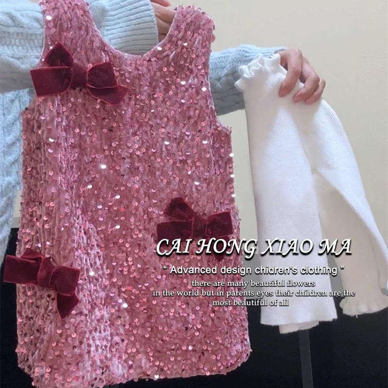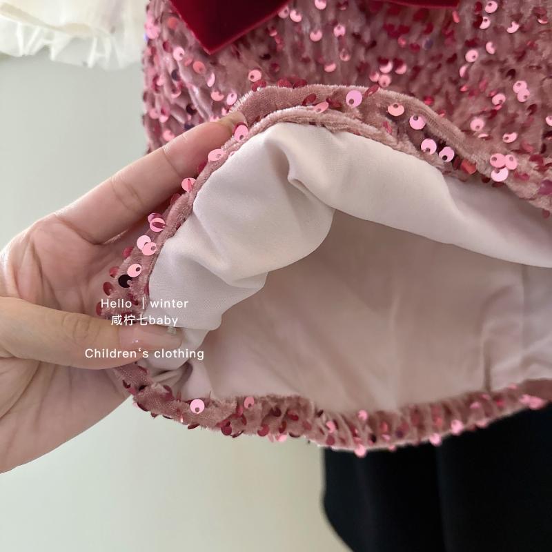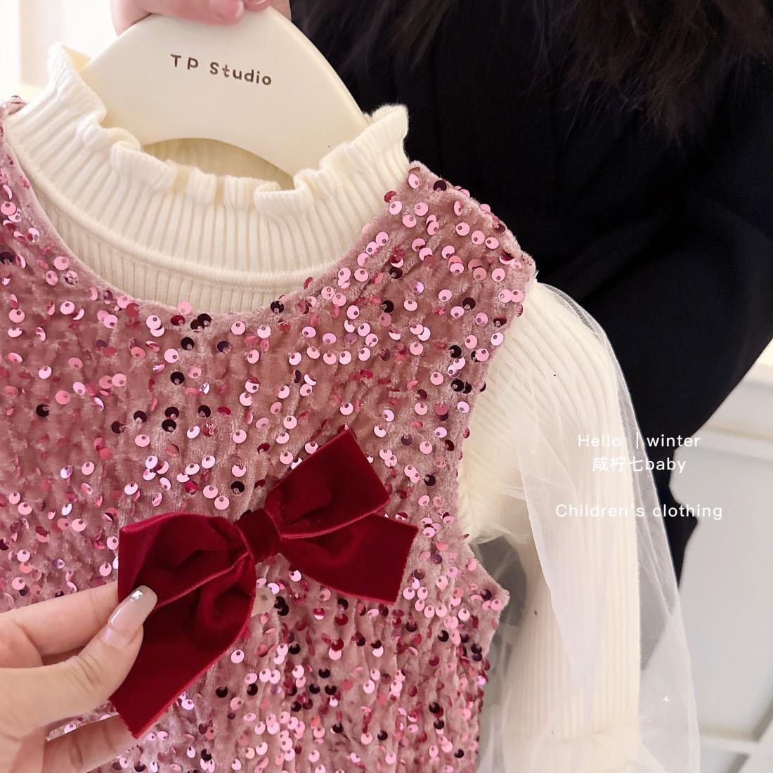 女童冬季连衣裙时髦闪耀亮片圣诞节礼服儿童过年蝴蝶结公主背心裙