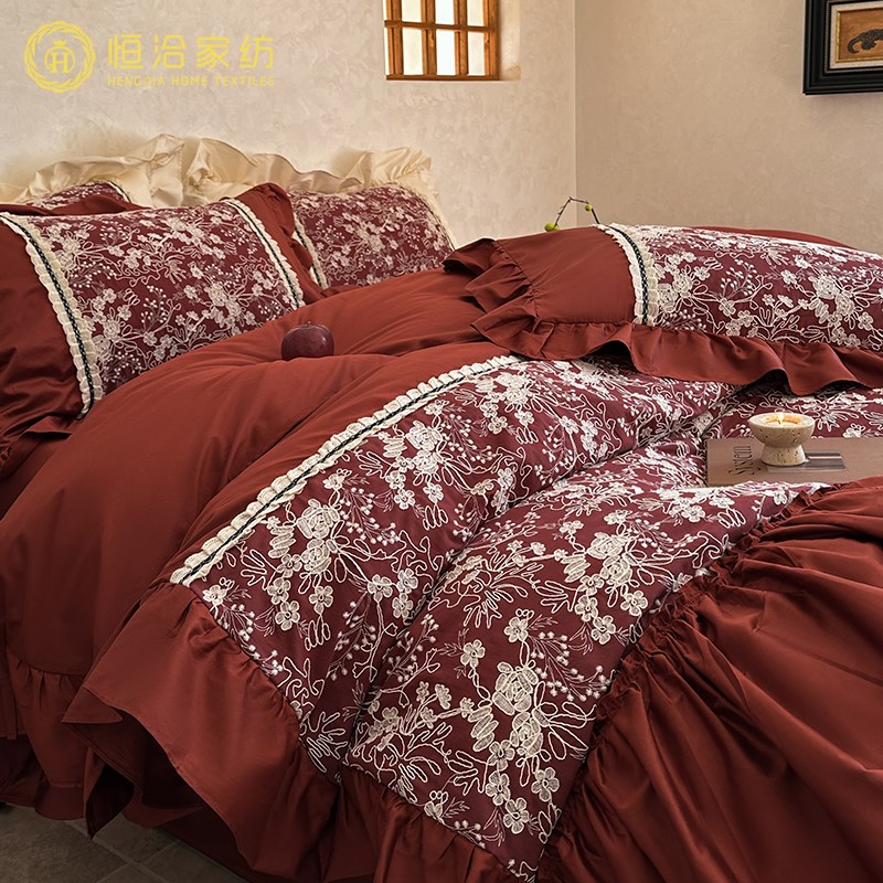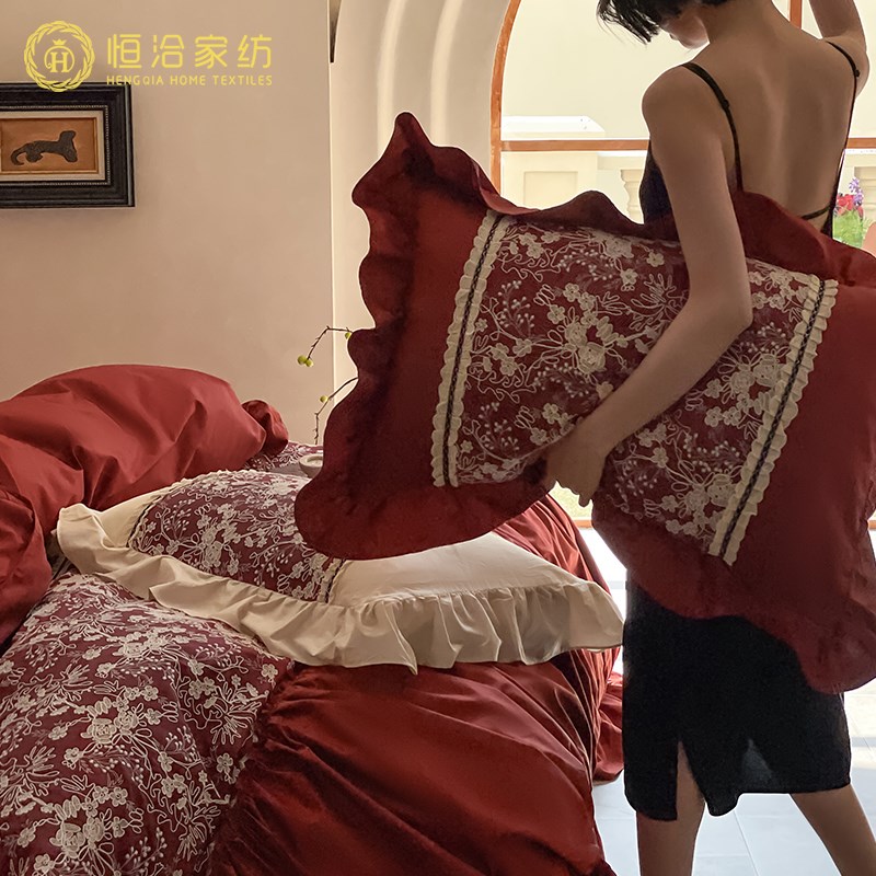婚庆法式浪漫全棉超柔四件套结婚红色花卉印染被套床上用品
