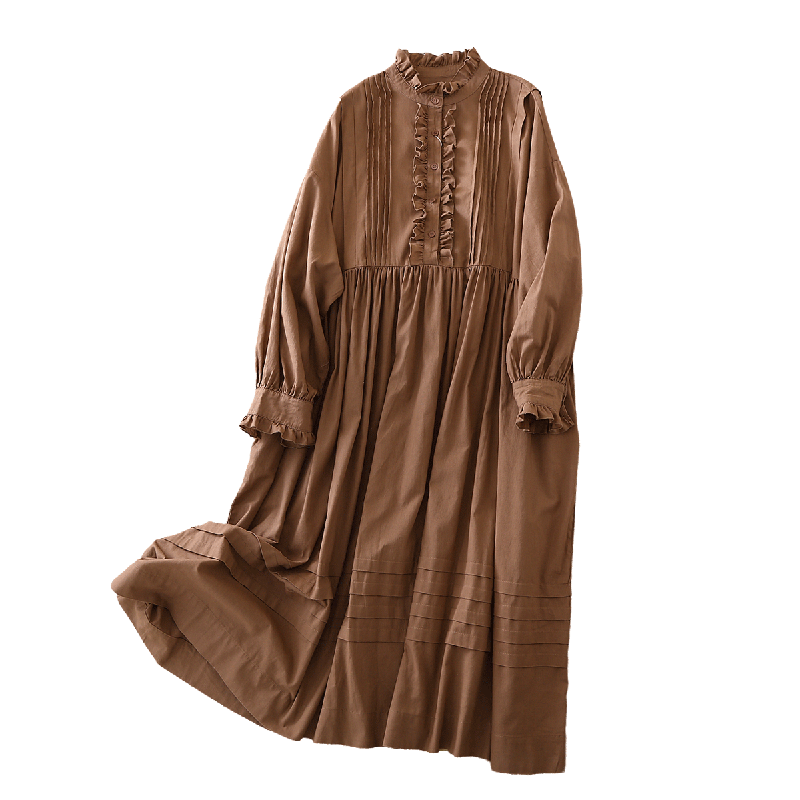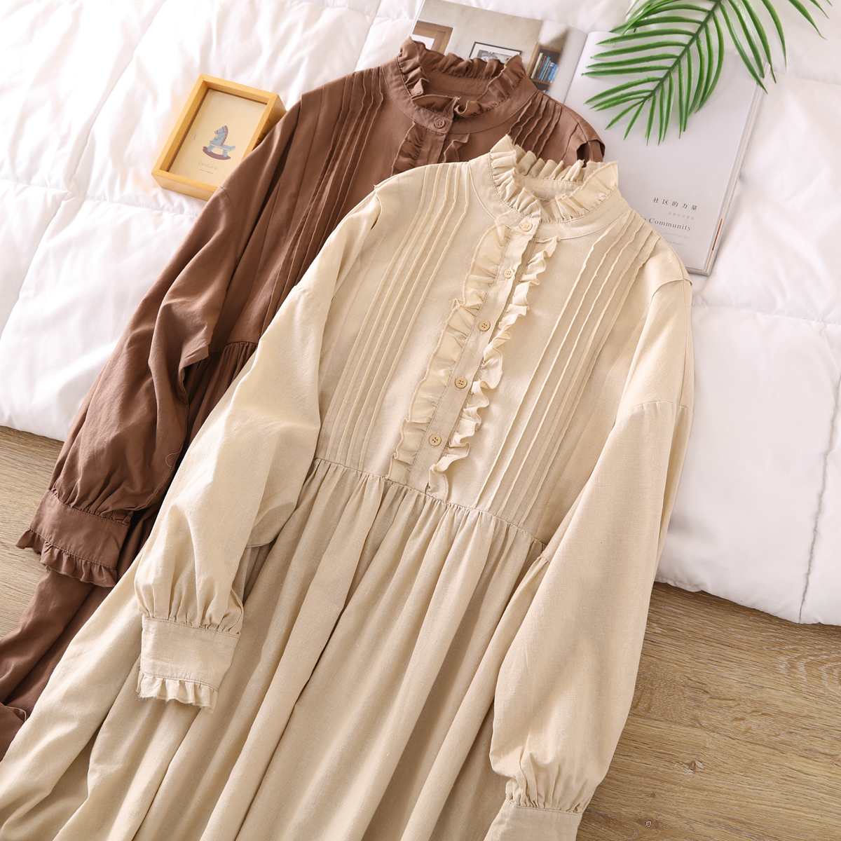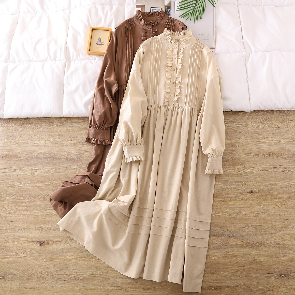 日杂风风琴褶木耳边长袖连衣裙女秋新款木耳领棉麻风 压褶中长裙