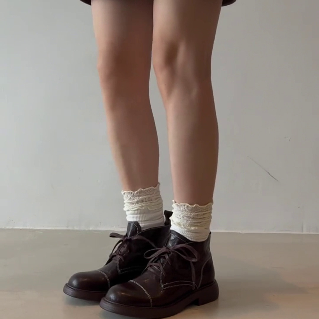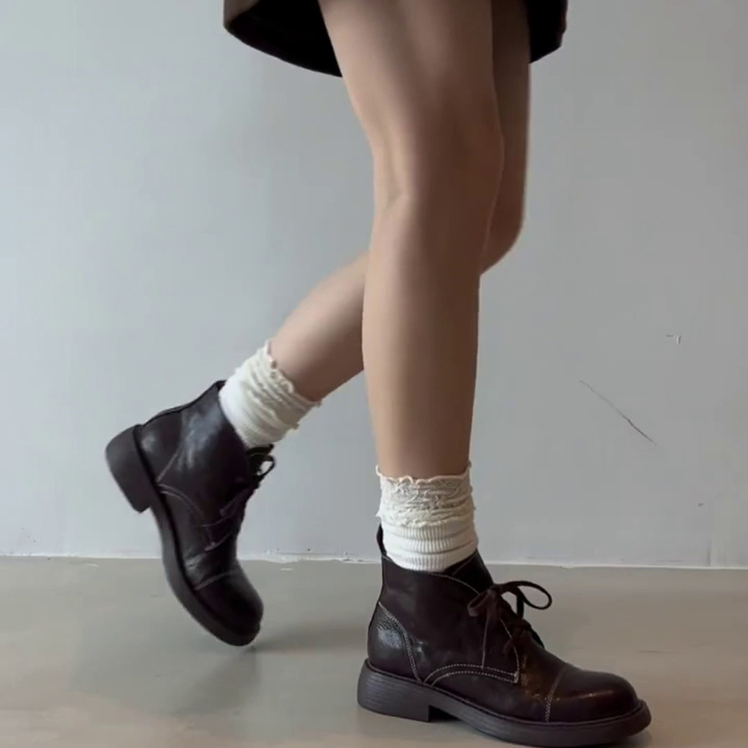 全羊皮~短靴女款马丁靴2025春秋新款圆头系带轻奢手抓纹牛皮单靴