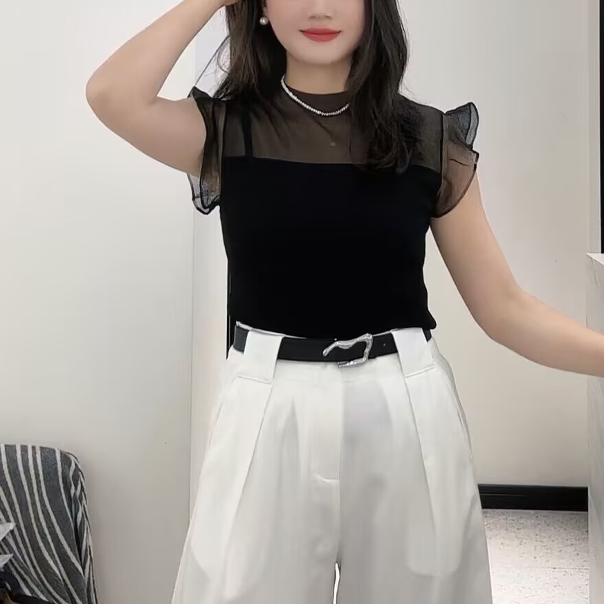 木耳肩2025夏季新款女装简约气质百搭蕾丝网纱短袖上衣时尚打底衫