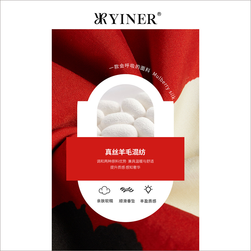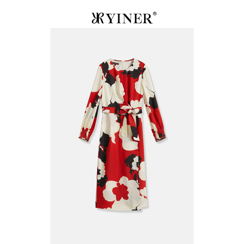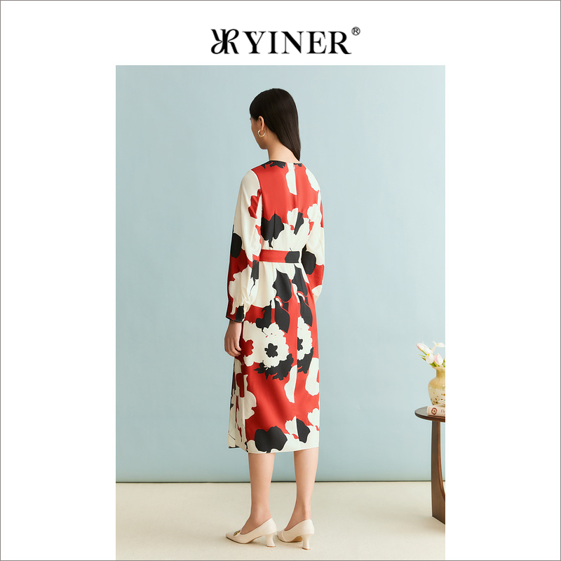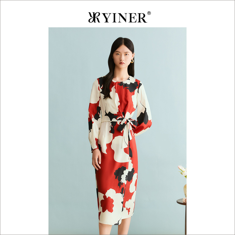 YINER音儿女装冬款时尚艺术印花系带收腰羊毛蚕丝混纺连衣裙