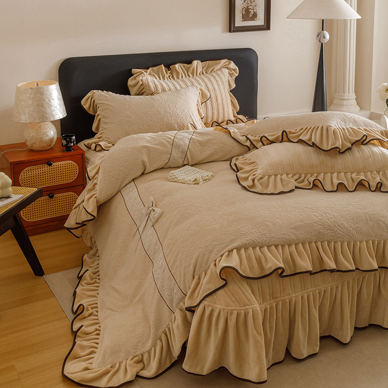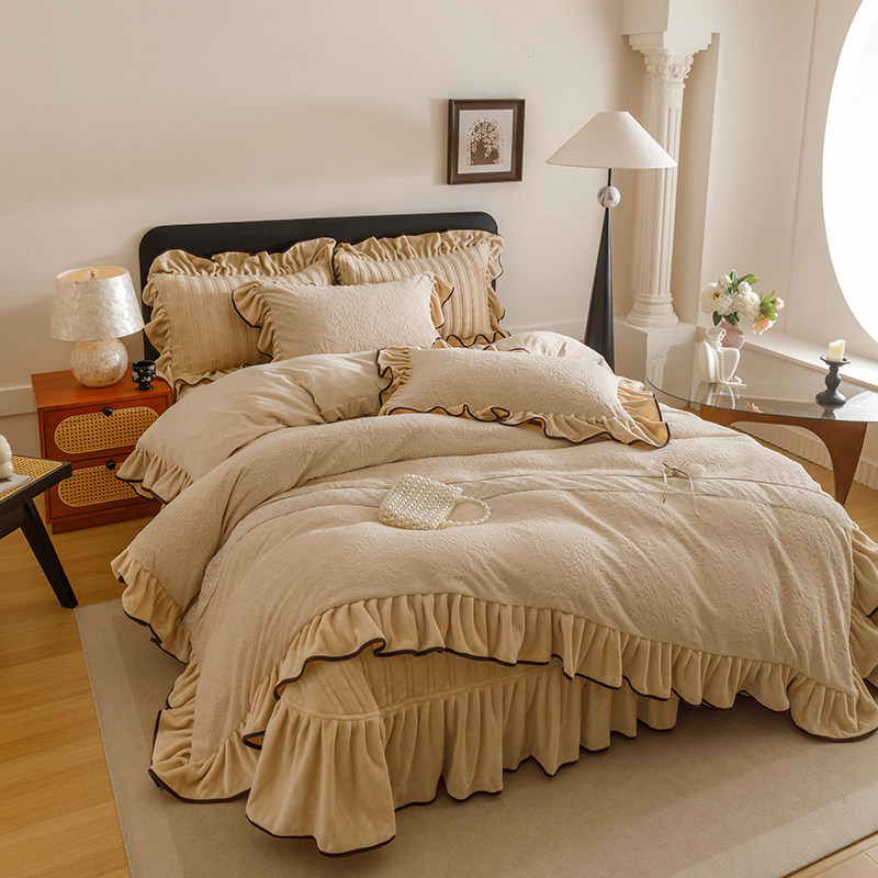 冬季A类牛奶绒四件套立体雕花被套刺绣花边加厚保暖床盖床上用品