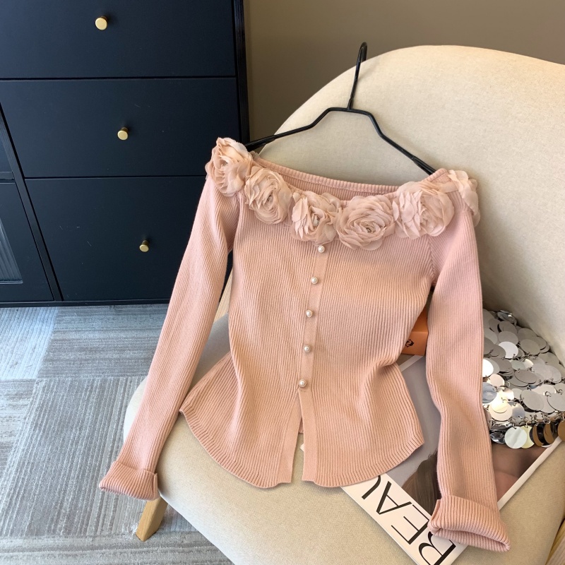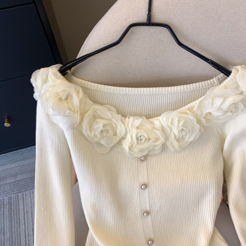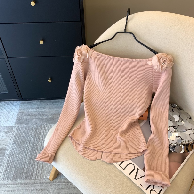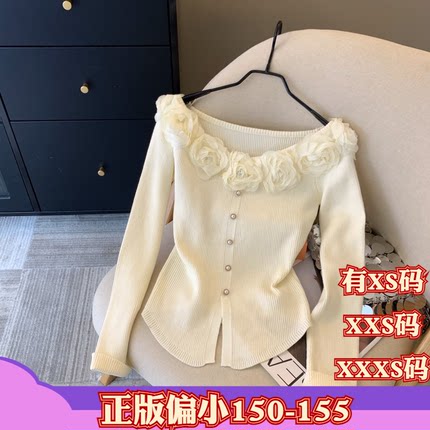 秋装女装矮个子150cmXXXS加小码显高花朵一字肩针织打底衫女露肩