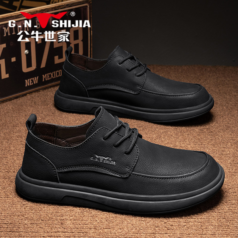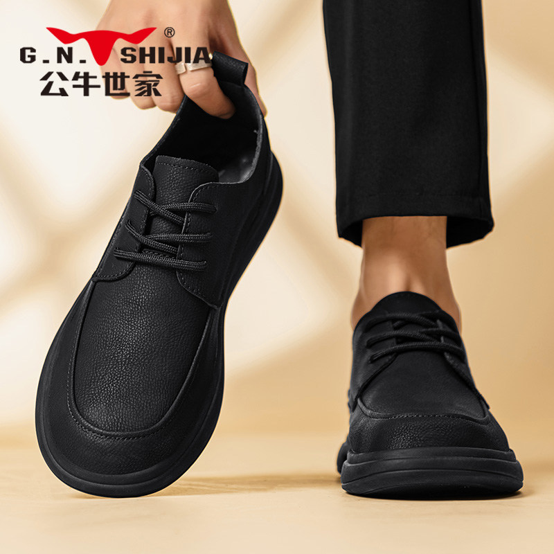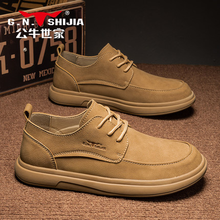 公牛世家男鞋冬季真皮英伦复古休闲皮鞋男软底黄色反绒高端豆豆鞋