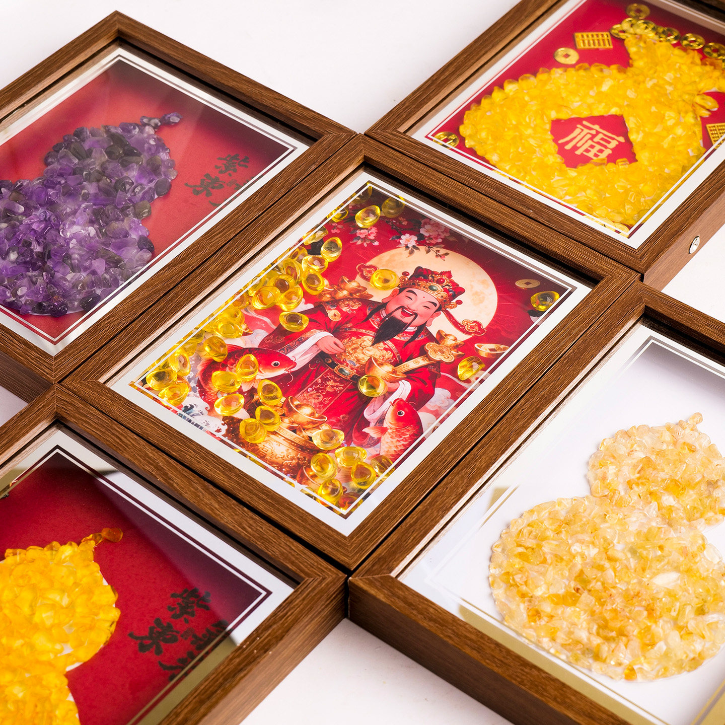 天然水晶新中式福袋钱袋碎石桌面摆台画实木相框装饰画高级摆件