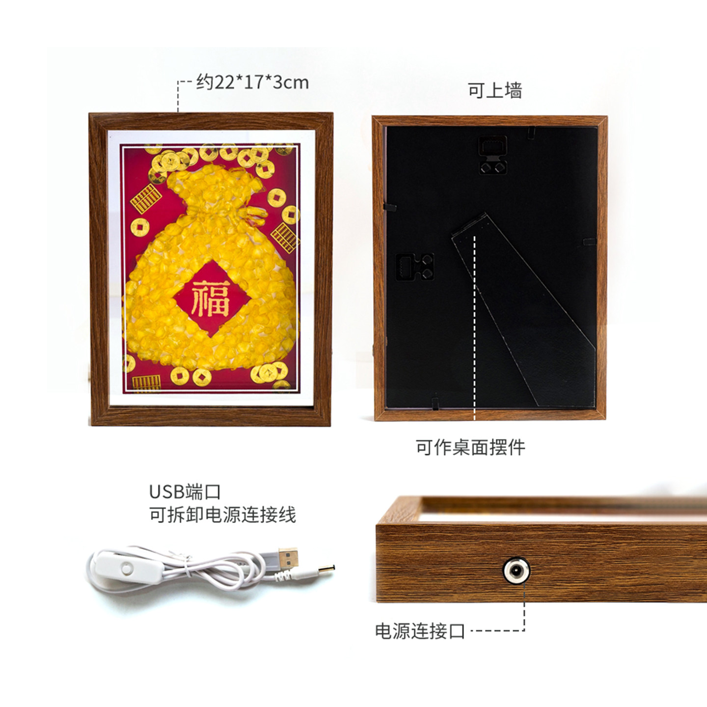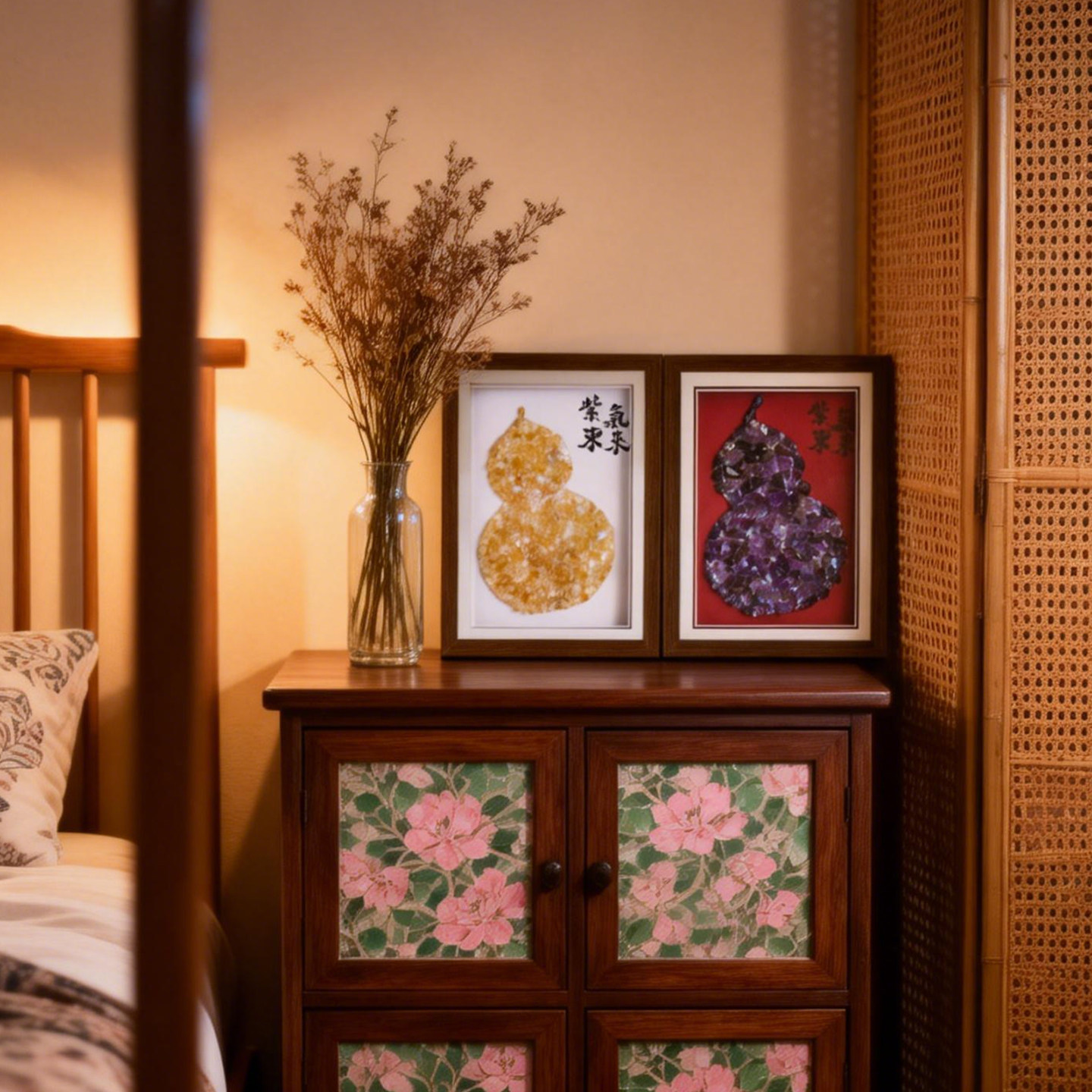 新中式天然水晶福袋实木摆台画