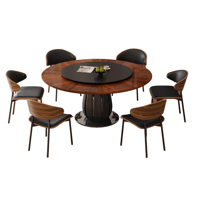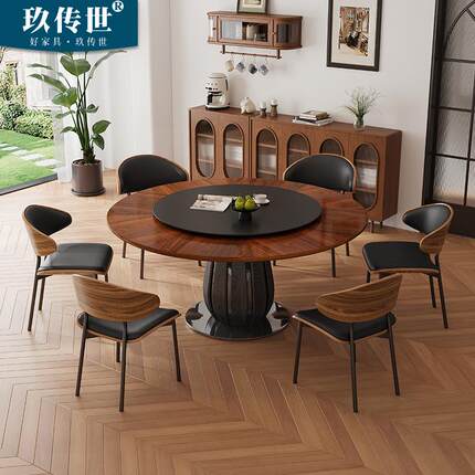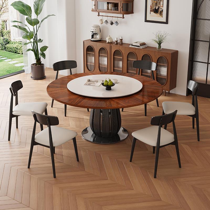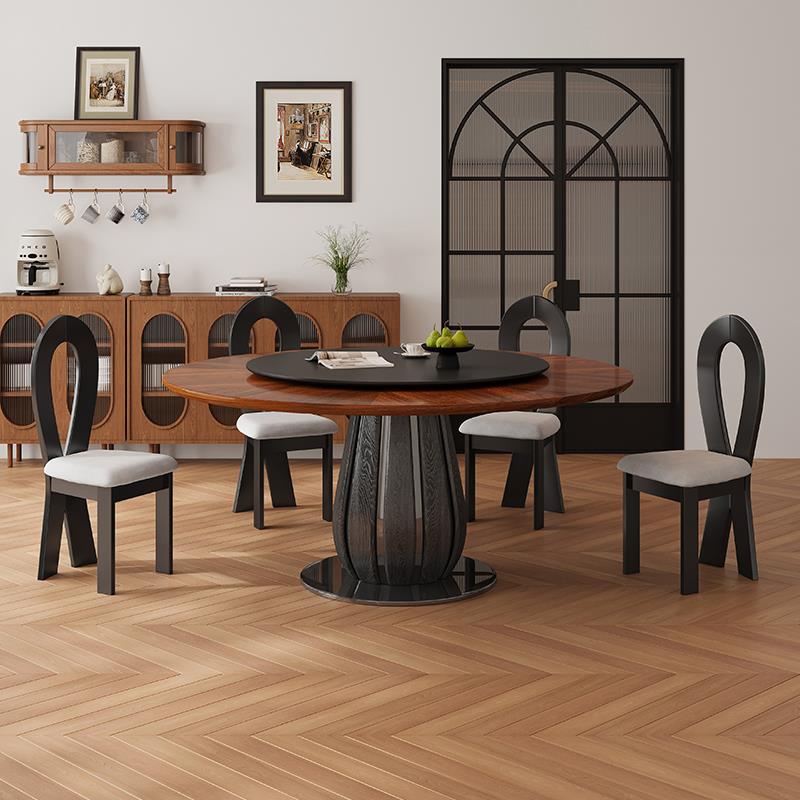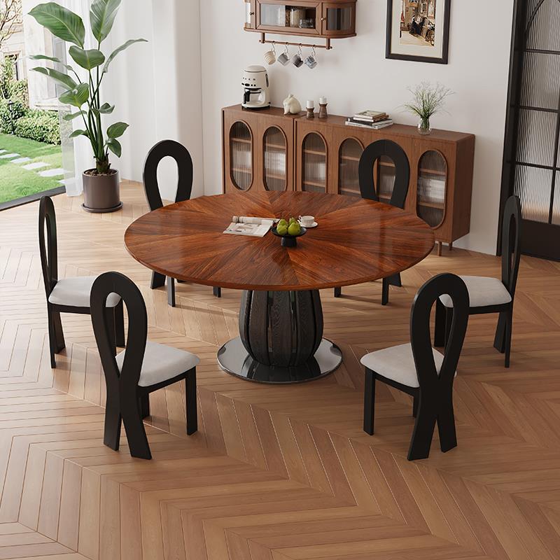 中古风实木餐桌复古风圆桌家用小户型法式黑胡桃木圆形餐桌椅组合