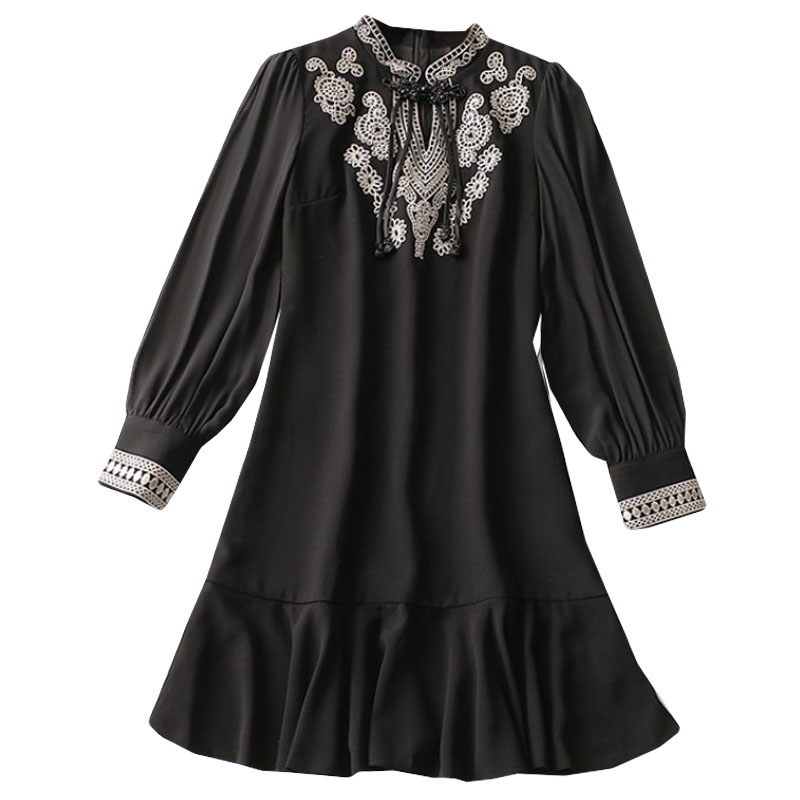 242251 秋醋酸纤维连衣裙 女绣花盘扣钉珠中国风长款长袖立领