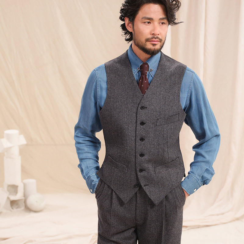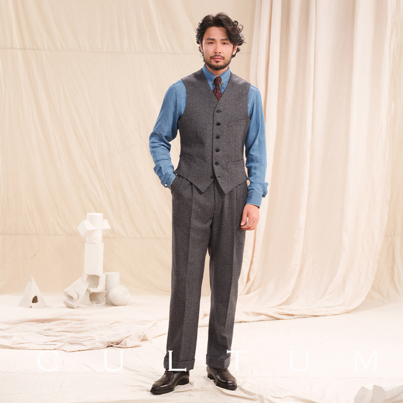 【绅士盔甲 50羊毛】CULTUM复古人字纹单排扣六粒扣V领西装马甲男