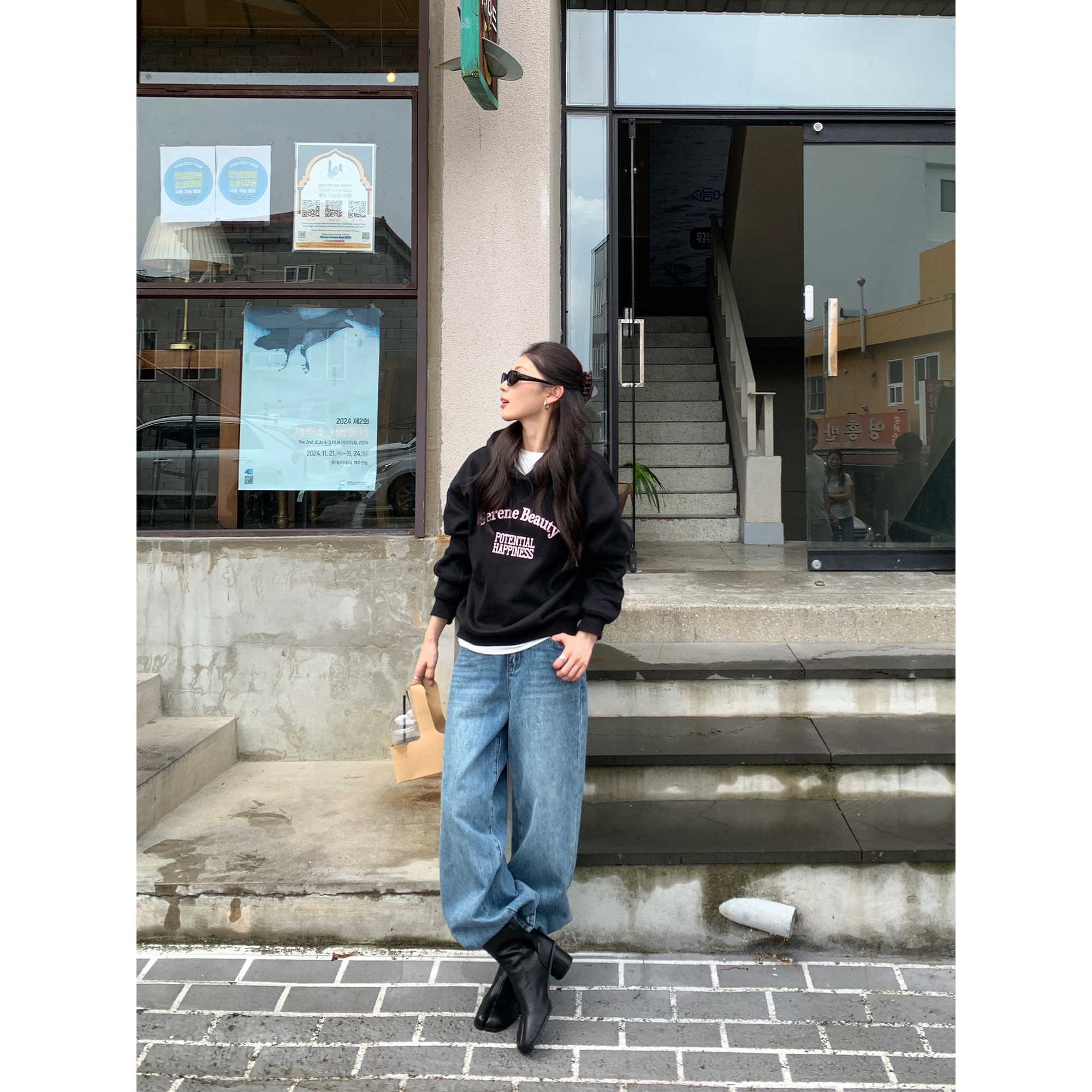 pusumede 慵懒速成 美式复古印花套头连帽卫衣女宽松加绒长袖上衣