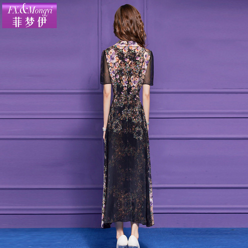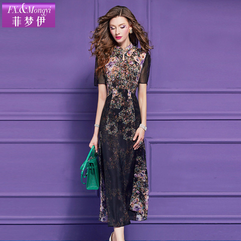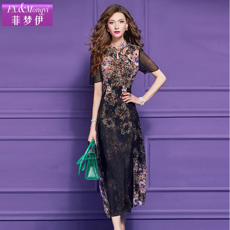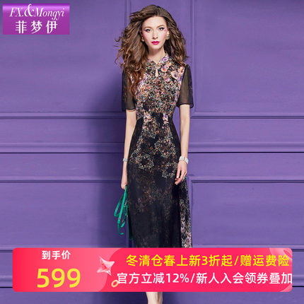 菲梦伊100桑蚕丝印花黑色连衣裙女夏季国风复古真丝新中式旗袍裙