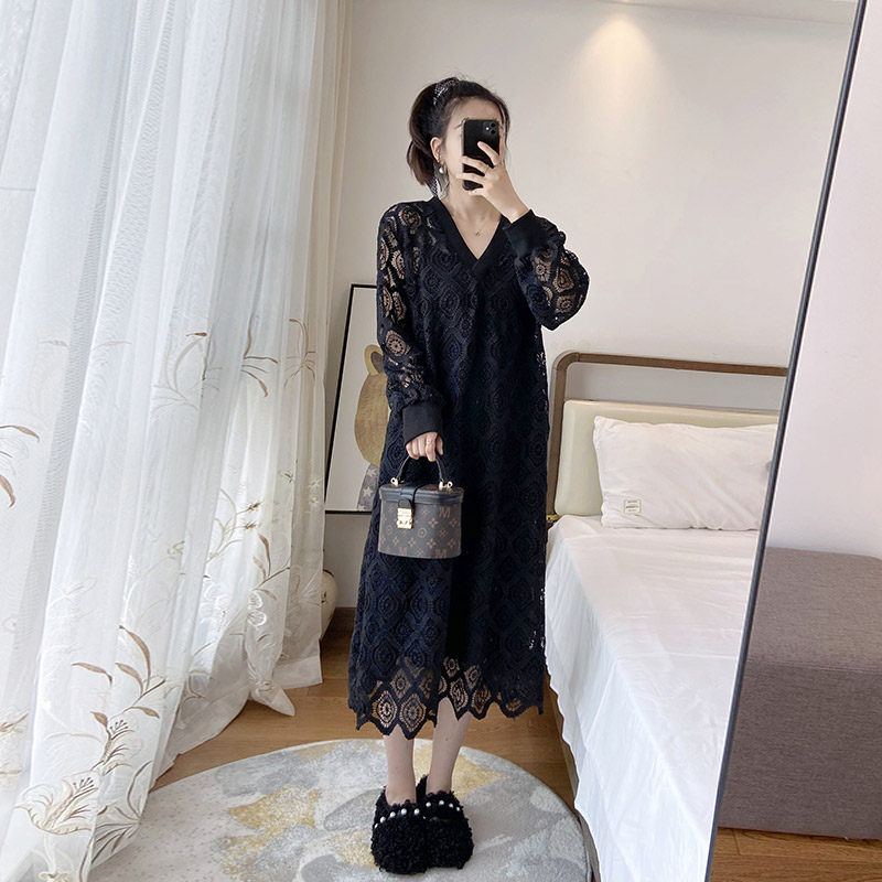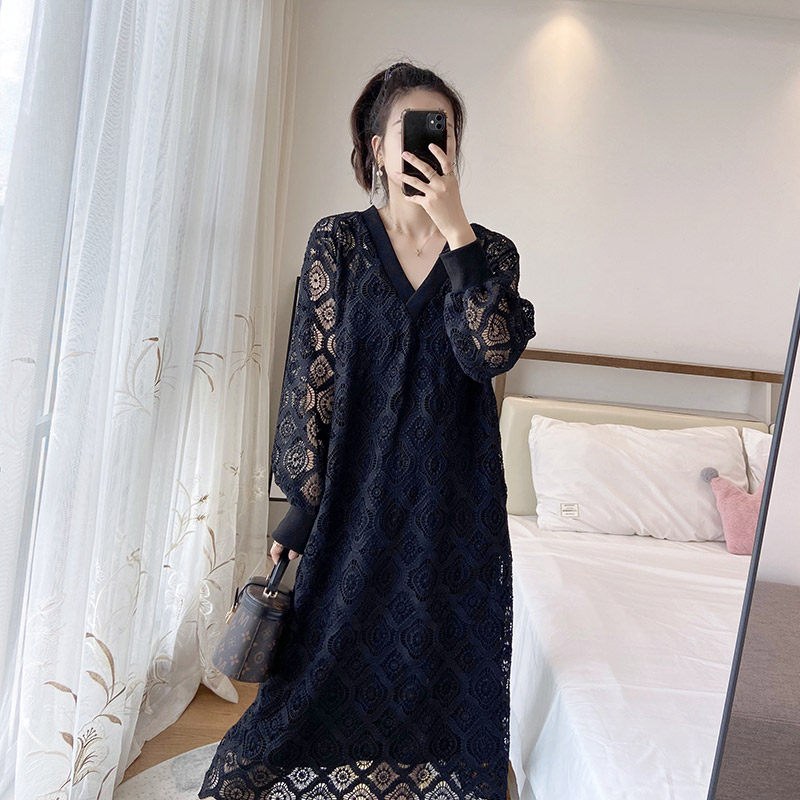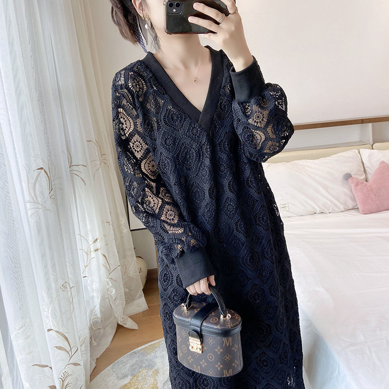 蕾丝连衣裙黑色长款大码显瘦胖mm秋季新款2024长袖女遮肉两件套潮