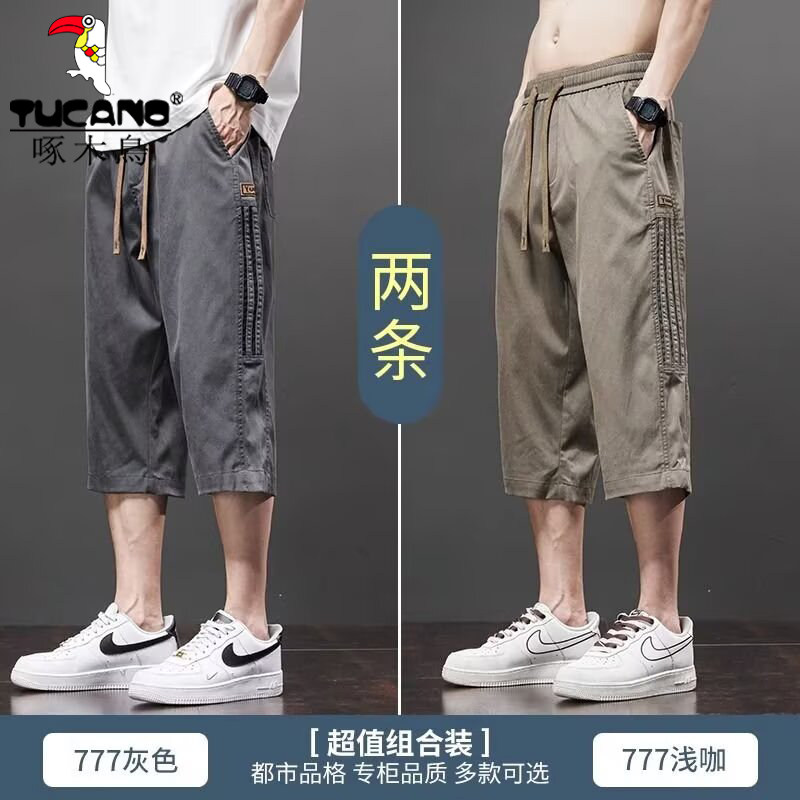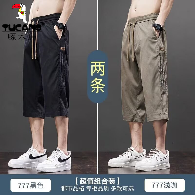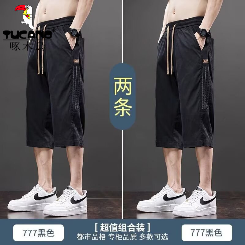 啄木鸟冰丝休闲短裤男士爸爸夏季薄款宽松外穿夏天冰丝七分裤子