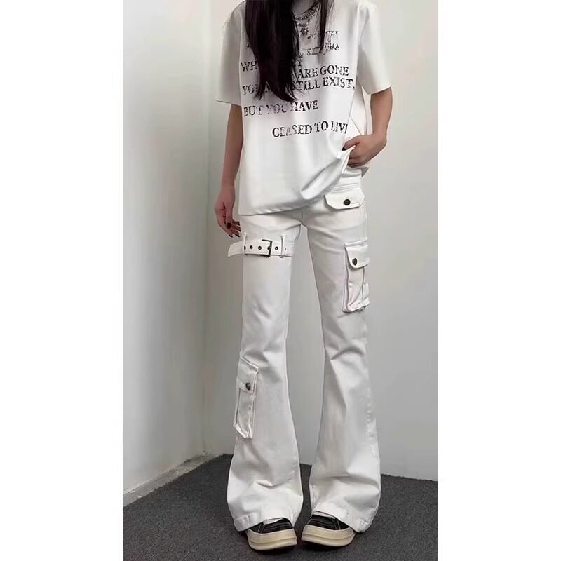cleanfit白色微喇弯刀牛仔裤男女夏季美式高街结构机能风工装裤子