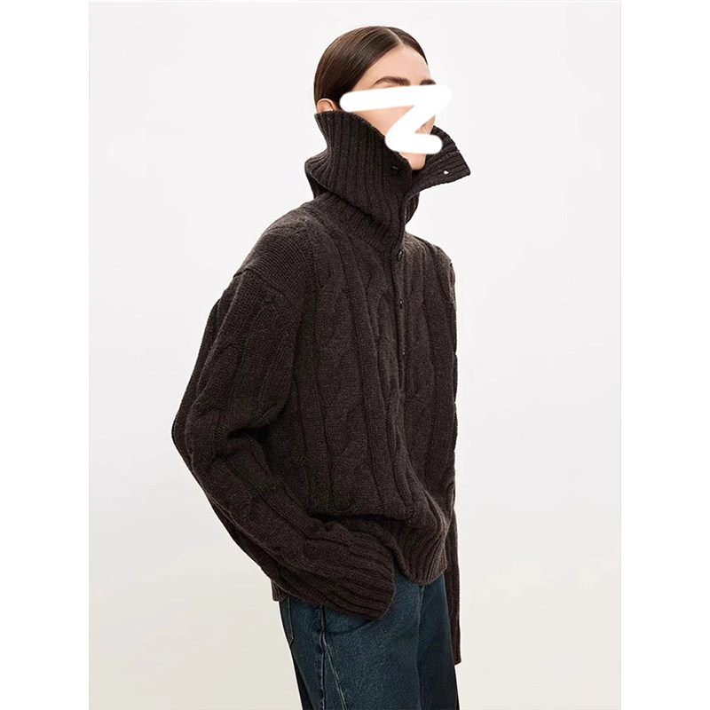 美式复古灰色高领麻花毛衣女秋冬老钱风穿搭翻领宽松针织衫上衣厚